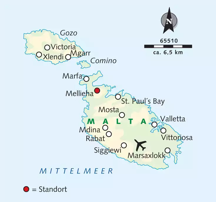 So wohnen wirHotel: Wir übernachten im Vier-Sterne-Hotel Solana in Mellieha. Das Hotel verfügt über eine Dachterrasse mit zwei Außenpools, einen Fitnessraum, ein voll ausgestattetes Spa mit Innenpool und beheiztem Außenpool, eine Bar und 235 komfortable Zimmer. Zimmer: Die Zimmer sind mit Klimaanlage, Heizung, Sat-TV, Telefon, WLAN, Safe, Minibar, Föhn und Balkon oder Terrasse ausgestattet. Verpflegung: Halbpension bestehend aus einem Frühstück und einem Abendbüffet (inkl. Wein, Bier, alkolholfreie Getränke, Mineralwasser, Tee und Kaffee) im Hotel. Lage: Das Hotel liegt im Zentrum von Mellieha. Mellieha zählt zu den ältesten Orten der Insel und verfügt über kleine Geschäfte des alltäglichen Bedarfs. Der nächste Strand ist in ca. 20 Gehminuten zu erreichen.