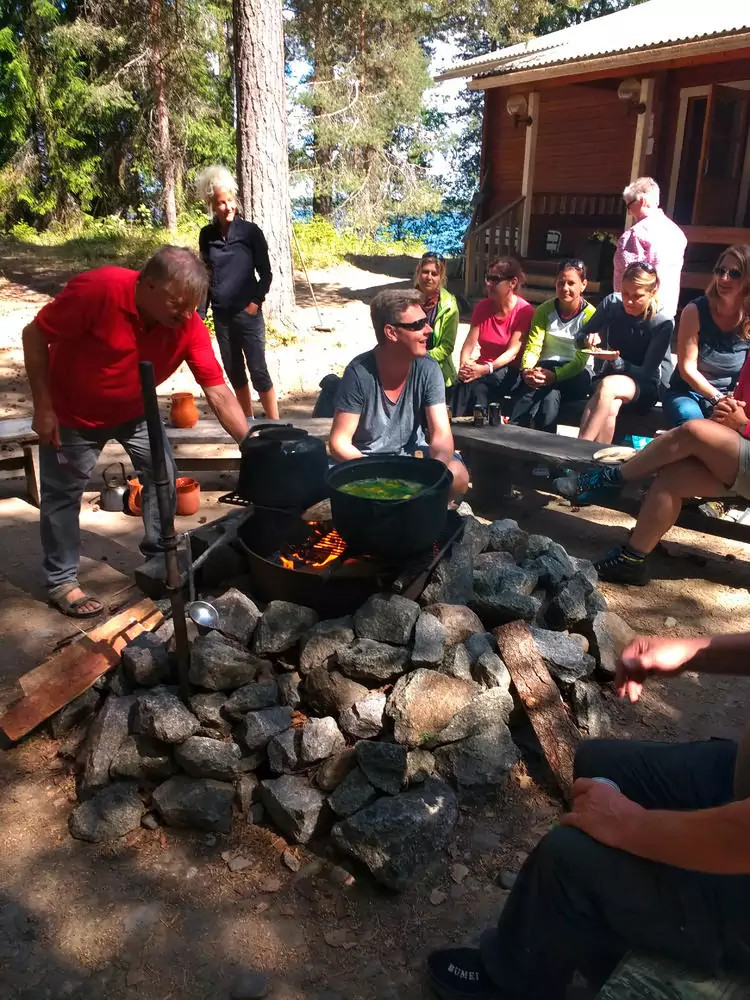 7. Tag: Ein finnischer Urlaubstag mit JariWir paddeln mit dem Kirchboot in ca. einer Stunde zur Insel Kaarnetsaari und unternehmen dort eine Erkundungswanderung (GZ: 1 1/2 Std.). Mit Jari, einem finnischen Original, bereiten wir gemeinsam ein Mittagessen zu: „Kalakeitto“ – eine traditionelle Fischsuppe, die über dem offenen Feuer zubereitet wird.