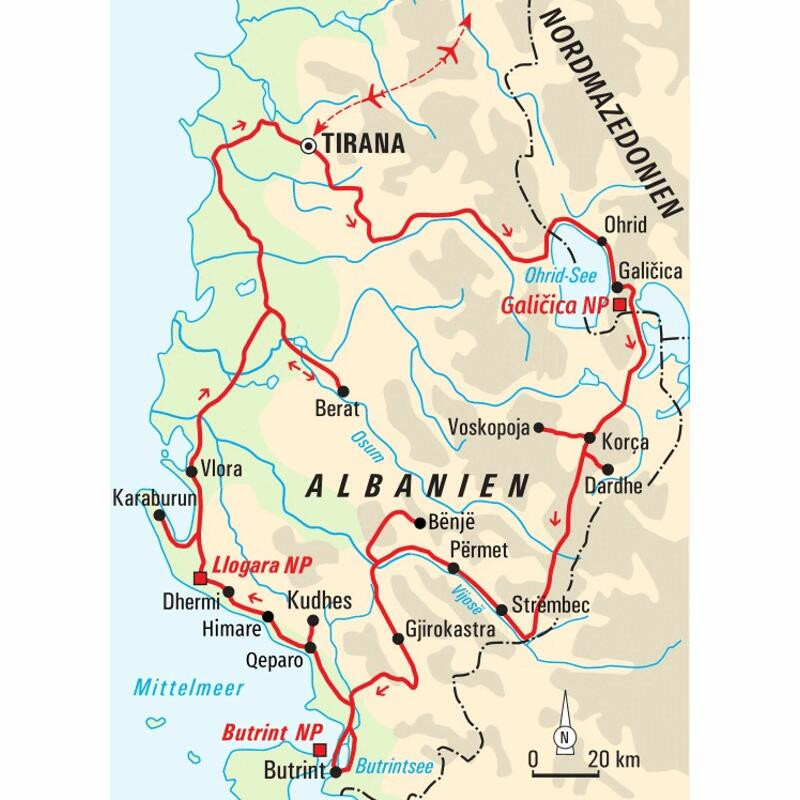 Wanderreise entlang der Küste und in die abgeschiedene Bergwelt SüdosteuropasMächtige Gebirgszüge mit weißen Kappen erheben sich über dem tiefblauen Wasser. Sonnenstrahlen tanzen auf der Oberfläche zum Takt der sanften Wellen. Grillen zirpen, Frösche quaken - und aus der Ferne klingt Musik. Die Landschaft rund um den Ohrid-See wirkt wie ein friedliches Gemälde und doch spürt man an diesem Ort die lebendige Geschichte. Antike Stätten prägen die noch weitgehend unbekannte Region Europas - Amphitheater, Burgen und Kirchen sind stumme Zeitzeugen einer großen Vergangenheit. Bauern mit ihren Eseln und Hirten mit ihren Schafherden ziehen gemächlich an uns vorbei und nehmen uns mit auf Zeitreise in ein vergessenes Europa. Die albanische Bergwelt und das nordmazedonische Hügelland wollen unbedingt zu Fuß erkundet werden. Wir wandern über die grünen Hügel und machen Halt in den urigen Dörfern. Wir besuchen uralte Klöster und bewundern die filigranen Holzbalkone der Kaufmannshäuser. In Ohrid genießen wir die feinen Spezialitäten vom Bauernmarkt, in Vlora probieren wir frisches Olivenöl aus der Ölmühle, in Benja besuchen wir eine Familie zu Hause und lassen uns von den Einheimischen ihre Geschichte(n) erzählen. Eine Reise auf den Balkan ist eine Reise in jahrtausendealtes Neuland.