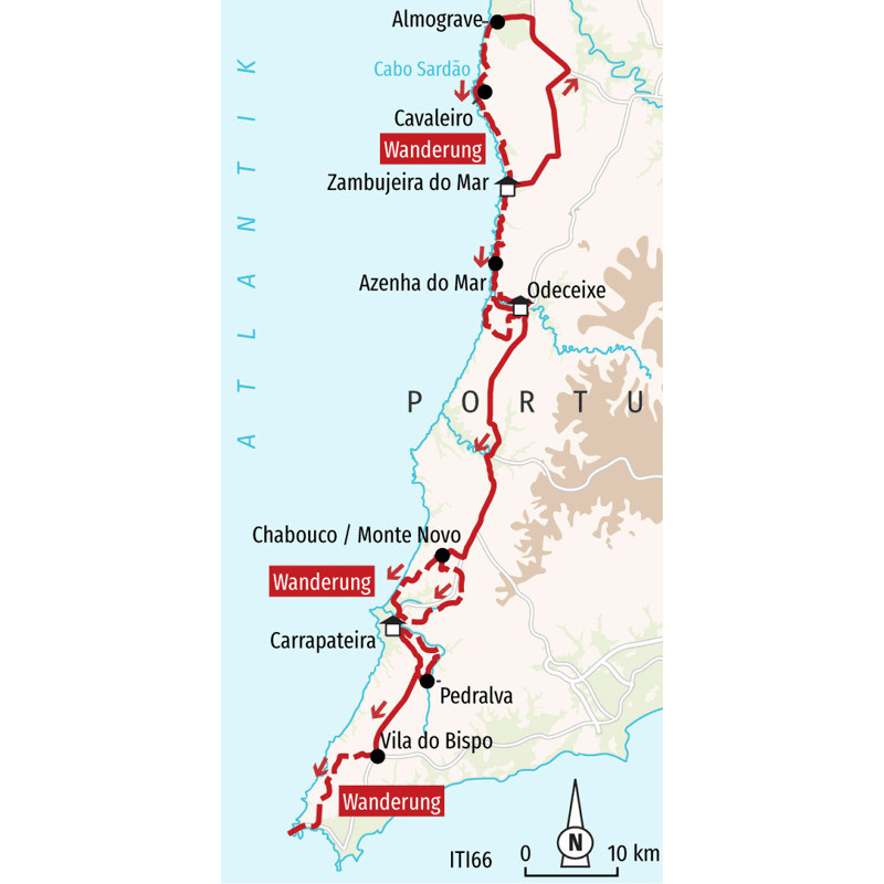 Wanderreise entlang der Rota Vicentina an der Westküste PortugalsSalzige Meeresluft weht Ihnen um die Nase, das Rauschen der Wellen begleitet Ihre Schritte – Sie wandern auf dem Fischerpfad entlang der wilden Westküste Portugals. Die Rota Vicentina führt Sie durch eine beeindruckende Küstenlandschaft: weite Strände, zerklüftete Klippen und der offene Atlantik stets im Blick. Sie durchstreifen die einsamen Dünen des Naturparks von Carrapateira und lassen den Blick schweifen, wenn am Cabo São Vicente die Brandung donnernd gegen die Felsen schlägt. Im Kontrast dazu zeigen Ihnen die Wanderungen ins fruchtbare Hinterland eine stillere Seite der Region: sanfte Hügel mit knorrigen Olivenbäumen, verstreute Dörfer und eine wohltuende Ruhe – weit entfernt vom Wind der Küste. Nach diesen ruhigen Momenten zieht es Sie wieder ans Meer zurück, wo spektakuläre Ausblicke und die Weite des Atlantiks auf Sie warten. Zwischen Almograve, Zambujeira do Mar und Odeceixe erleben Sie die authentische Küstenkultur Portugals. Ob beim Aufstieg zur Windmühle, beim Spaziergang durch kleine Gassen oder bei fangfrischem Fisch in einem der kleinen Hafenorte – diese Sefguided-Reise verbindet intensive Naturerlebnisse mit der entspannten Lebensart des Südens. Ein Wandererlebnis am atlantischen Ende Europas, das nachwirkt.