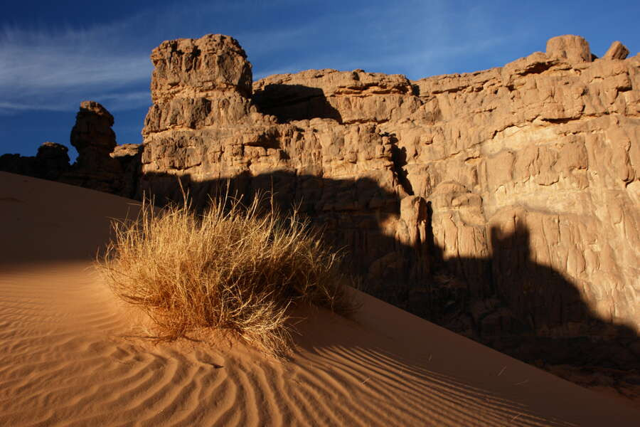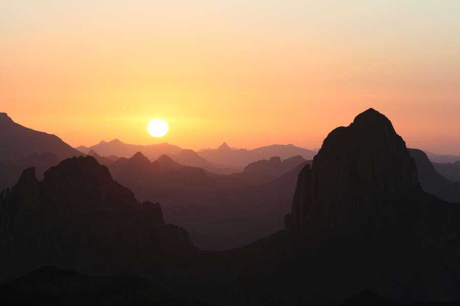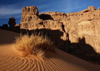 Trekkingreise mit den Tuareg durch die Wüste in Südalgerien und Besteigung des Tahat, 3003 m Das Hoggar ist eine der beiden auf jeder Afrika-Karte deutlich herausragenden Gebirgsmassive mitten in der Sahara. Sieben Tage lang trekken wir durch Regionen, die nur zu Fuß erreicht werden können: Vorbei an gigantischen rosafarbenen Granitkugeln, durch Wadis voller Oleander und mit Wasser gefüllten Felsbecken. Begleitet von den Tuareg und ihren Kamelen nähern wir uns dem für sie heiligen Berg Ilamane. Als besonderer Höhepunkt besteht die Möglichkeit, den Dreitausender Tahat und damit den höchsten Berg Algeriens zu erklimmen. Auf dem Assekrem Hochplateau besuchen wir die ehemalige Klause des Forschers Charles de Foucauld, der hier Anfang des 20. Jahrhunderts als Eremit lebte. Zum Assekrem schrieb er: "Die Aussicht übertrifft in ihrer Schönheit alle Worte und Vorstellungen. Nichts vermag den Zauber dieses Waldes von Felsspitzen und -nadeln, den man zu seinen Füßen hat, zu beschreiben." Wenn wir beim vielleicht schönsten Sonnenuntergang der Sahara ein Meer erloschener Vulkane und Basaltdome in pastellfarbenes Licht getaucht sehen, kommen wir sicherlich zum selben Schluss. Der zweite Teil der Reise führt uns in den Nationalpark Tassili n´Ajjer, wo weitere Facetten der Sahara auf uns warten: Tiefe Schluchten, Zypressen sowie ein Spiel aus Sandsteinformationen und einem endlosen Dünenmeer. Vom einst regen Leben und der damaligen Kunstfertigkeit zeugen prähistorische Felsbilder. Ein unermesslicher kultureller Wert im Zusammenspiel mit der landschaftlichen Vielfalt machen Algerien zu einem Reiseziel, dass uns im Handumdrehen zu Wüsten-Liebhabern macht.