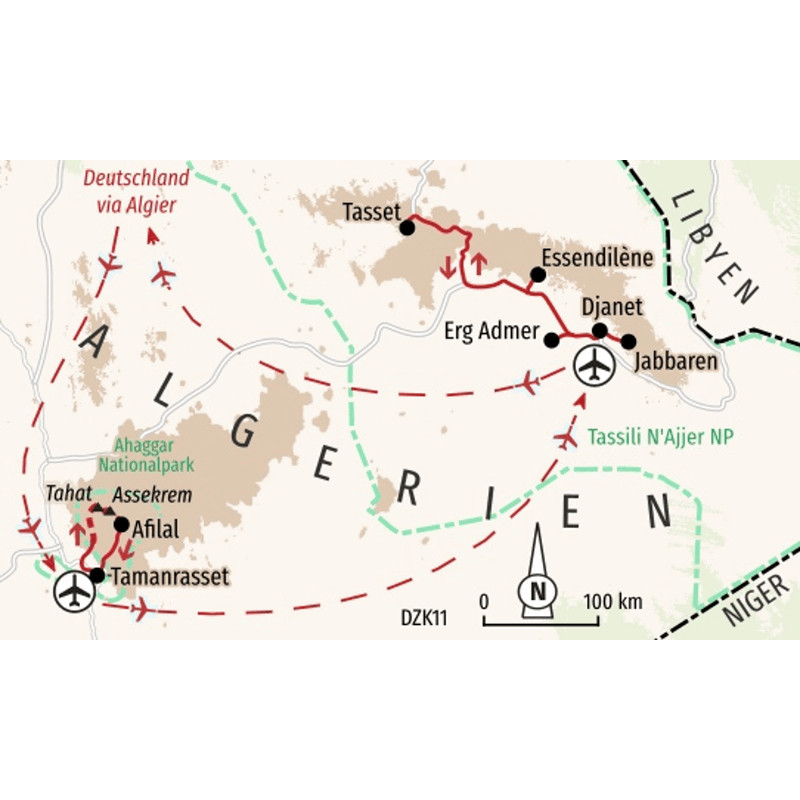 - Deutschsprachige Hauser-Reiseleitung ab/bis Deutschland<br>Linienflug mit Air Algerie (Economy, Tarifklasse Q) von Frankfurt nach Tamanrasset und zurück von Djanet, nach Verfügbarkeit<br>Inlandsflug mit Air Algerie von Tamanrasset nach Djanet<br>Förderung eines Klimaschutzprojektes von atmosfair<br>Flug-/Sicherheitsgebühren (ca. 100 €)<br>Rail & Fly-Fahrkarte in Deutschland und Österreich<br>Übernachtung 1 x im Gästehaus (Gemeinschaftsbad), 12 x im Zelt<br>Vollpension<br>Gepäcktransport<br>Koch- und Begleitmannschaft<br>Sicherheitsausrüstung: Sat-Telefon<br>Reisekrankenschutz<br>