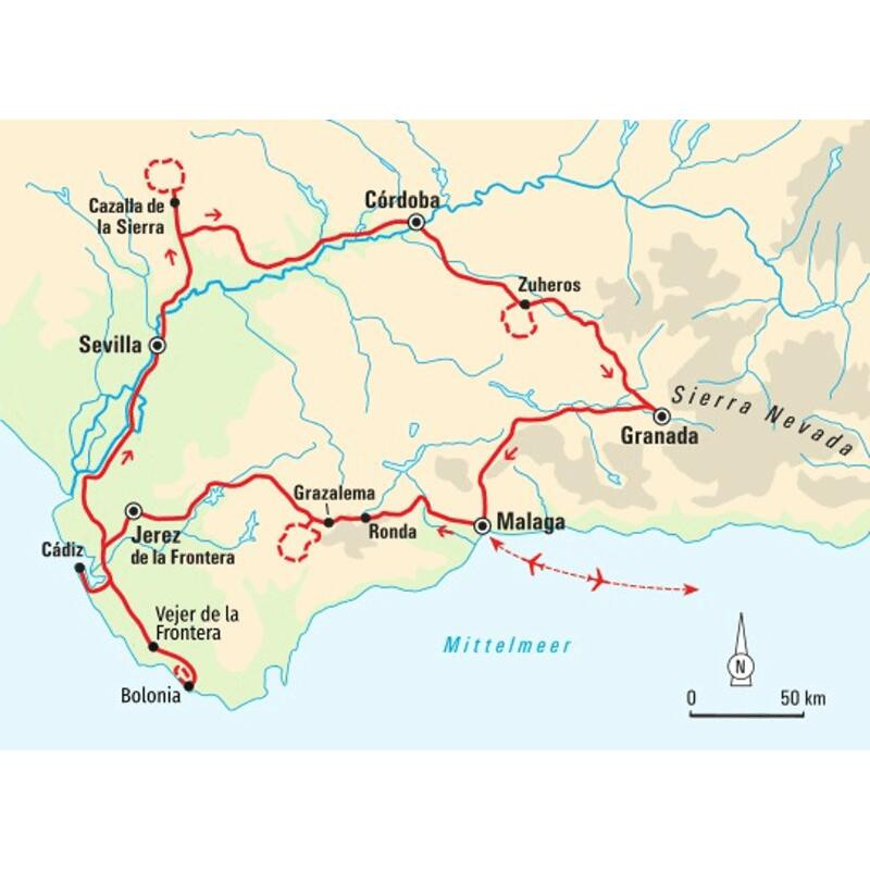 Wanderreise in die schönsten Naturparks mit Besuch der Städte Granada, Sevilla, Córdoba und CádizKarstige Hochebenen, schattenspendende, uralte Kork- und Steineichen, kalkweiße Dörfer und bunte Städte. Dazu eine Prise andalusischer Köstlichkeiten und schon verwandelt sich der Süden Spaniens zu einer unwiderstehlichen Mischung. Cádiz, Sevilla, Córdoba und Granada, römische Tempel, Moscheen, Synagogen und Kirchen – ungeachtet des kulturellen und architektonischen Potpourris weht der Duft von Orangenblüten unermüdlich durch die Gassen. Vor allem die alten Städte sind erfüllt von Leben und das fröhliche Treiben ist geradezu ansteckend. Musik liegt in der Luft. Wir bewundern den mächtigen Alcazar von Sevilla, erklimmen den Burgberg der Alhambra von Granada und atmen die Geschichte im Säulenwald der Moschee-Kathedrale von Córdoba. Und auch die Natur zeigt uns ein märchenhaftes Spektrum der Gegensätze: Das romantische Ronda thront hoch über der mächtigen Schlucht El Tajo. Vom römischen Baelo Claudia gehen wir am Strand über die Düne von Bolonia und spüren die Nähe Afrikas. In den üppig-grünen Bergen der Sierra de Grazalema erwartet uns eine einzigartige Pflanzenwelt. Wir wandern durch beschauliche Naturparks, erkunden quirlige Städte und bummeln durch kleine Dörfer, in denen sich Häuser wie Bauklötze übereinander stapeln. Wir streifen durch schattige Wälder und schnuppern ein bisschen Meeresluft. Dazu noch einen Sherry an der Bar, Flamenco auf der Straße und Tapas in den Bodegas - Andalusiens Traumkulisse steckt voller Kontraste!