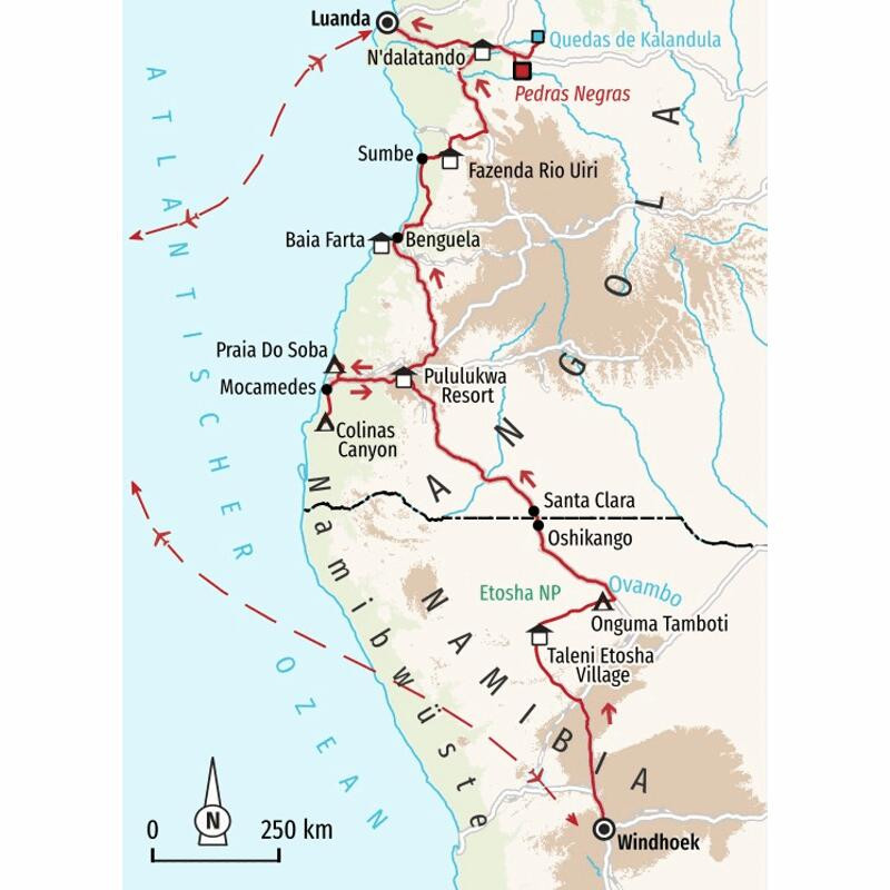 Vom Etosha NP, Colinas Canyon, Atlantikstränden, Benguela und Pedras Negras bis zu den Kalandula WasserfällenWir streunen durch eine fast unwirkliche Savannen-Landschaft, rund um uns erheben sich große, schwarz anmutende, mit einer Art Moos überzogene Felstürme, alle unterschiedlich von Erosion geformt. Es hat fast etwas Mystisches und es verwundert nicht, dass sich hier im früheren Königreich Ndongo einige Legenden um diese Monolithen ranken. So soll die schöne Kriegerkönigin Njinga einst ein Bad in einer der Quellen zwischen den Felsen genommen haben und dabei von fremden Soldaten überrascht worden sein. Entsetzt und erschrocken, gelang es Njinga über die Felsen zu fliehen. Noch heute findet sich ein Fußabdruck von ihrer energischen Flucht an einem Felsen. Den Gegensatz bilden die Sandsteintürme im Colinas Caynon, ebenfalls über Jahrhunderte vom Wind geformt, färben sich die felsigen Monumente in wunderschöne Rottöne und bilden gigantische Überreste auf dem Wüstenboden. Tropische Atlantikstrände, ein üppig grünes Hochland und die Tiervielfalt im Etosha Nationalpark vervollständigen die Kombination zweier faszinierender Länder, auch kulinarisch mit Grillfleisch und scharfer Piri Piri Sauce.