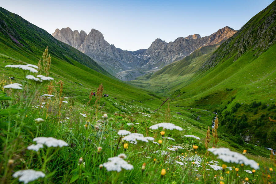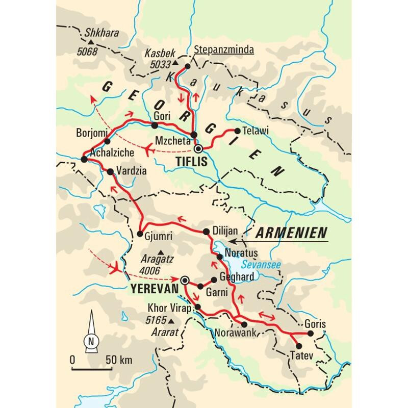 Wanderreise von der Ararat-Ebene bis zum Großen KaukasusDie weißen Berggipfel umzingeln die blühende Natur wie gigantische Wachposten. Turmfalken und Gänsegeier ziehen ihre Kreise, Gämse und Steinböcke grasen zufrieden an den Berghängen. Die Sonne erhebt sich langsam hinter den Hügeln, die Luft ist klar und frisch. Die Natur wirkt so friedlich, als wäre dieser Teil der Erde noch nicht von Menschen entdeckt. Dabei war diese Region seit jeher ein Durchgangsland der Völker. Zwischen Europa und Asien, zwischen Schwarzem und Kaspischem Meer, zwischen Islam und Christentum, zwischen Antike und Moderne – Armenien und Georgien waren schon früh im Mittelpunkt des Zeitgeschehens. Hier strandete die Arche Noah, hier suchten die Argonauten das Goldene Vlies und hierher brachte Prometheus das himmlische Feuer. Wir wandern am Fuße des Großen Kaukasus und behalten die Gipfel der Fünftausender stets im Blick. Wir entdecken die frühchristlichen Klöster Armeniens, die stolzen Wehrkirchen Georgiens und die hellenistischen Tempel Kaukasiens. Dabei lauschen wir den Geschichten der griechischen Mythologie am Kasbek, staunen über die Basaltformation "Symphonie der Steine" in der Azat-Schlucht, kosten Weintradition in Kachetien und lüften in Garni das Geheimnis der traditionellen Brote. Wir bewundern die architektonische Vielfalt in Tiflis, die Monumentalbauten von Jerewan und die beeindruckenden Karawansereien in beiden Ländern, die den Reisenden entlang der Seidenstraße Unterschlupf gewährten. Die beiden Länder gleichen einer Schatzkammer – und wir werfen gemeinsam einen Blick hinter die Türe.