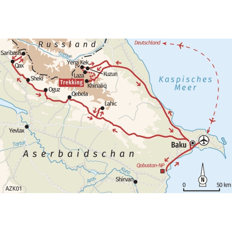 Trekkingreise von Baku an den Berg Shahdag, in den Bezirk Qax und zum Nationalpark QobustanJahrtausende alte Felsgravuren und antike Festungen, raue Bergwelt und Schlamm spuckende Vulkane. Aserbaidschan überrascht – Tradition trifft auf Moderne, der Orient auf futuristische Architektur. Diese Gegensätze verzaubern und machen, zusammen mit der kaukasischen Gastfreundschaft, der schmackhaften, traditionellen Küche und den faszinierenden Landschaften, die Anziehungskraft des Landes aus. Das "Land des Feuers", zwischen Kaspischem Meer und dem Kaukasus, vereint unterschiedlichste Facetten und wir brechen auf, um diese zu erkunden. Rund um den Berg Shahdaq trekken wir entlang durchfurchter Felsmassive auf alten Pfaden von Dorf zu Dorf, übernachten dabei in Homestays und machen Bekanntschaft mit der Lebensweise der Menschen im Kaukasus. In den malerisch gelegenen Bergdörfern Khinaliq und Qriz wird tatsächlich eine eigene Sprache gesprochen und auch das Gebirgspanorama lässt uns staunen. Baku liefert das Kontrastprogramm. In der Metropole schlendern wir entlang der Flaniermeile, bewundern die gläsernen Flame Towers, stöbern durch bunte Waren auf dem Basar und besuchen den sagenumwobenen Jungfrauenturm. Grüne Hügel und geschichtsträchtige Dörfer hingegen sind Kennzeichen der Region Qax. In der Stadt Sheki und dem Bergdorf Kish ist die Seidenstraßenvergangenheit des Landes für uns spürbar, in den Gassen von Lahic wird alte Schmiedekunst betrieben. Vielleicht findet sich ein schönes Souvenir? Im Qobustan-Nationalpark entdecken wir blubbernde Schlammvulkane und prähistorische Petroglyphen. Aserbaidschan liefert uns unzählige Eindrücke.