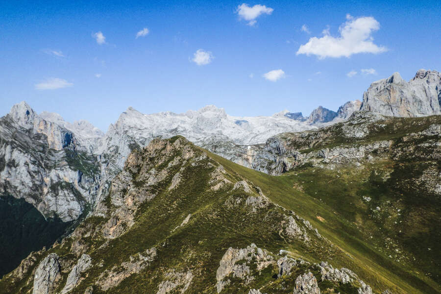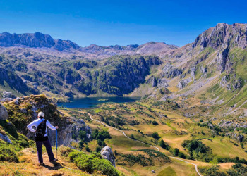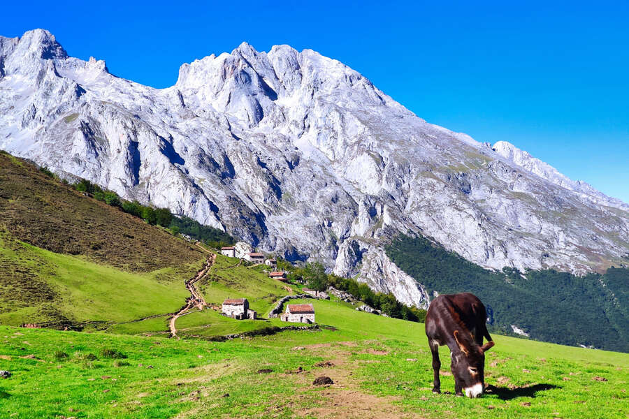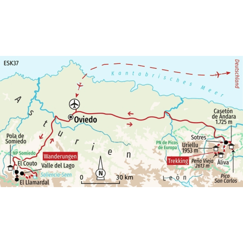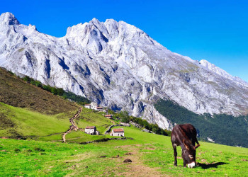 Wanderreise mit Trekking in Asturien und im Naturpark SomiedoIm Zickzack reihen sich die Gipfel aneinander, dazwischen glitzern Gletscherseen in der Sonne. Kurz darauf schieben sich Wolken vorbei und lassen die Landschaft in einem völlig neuen Licht erscheinen. Die wilden Blumenwiesen wiegen sanft im Wind und vereinzelt stehen verlassene Hirtenhäuschen auf den Weiden. Über uns zieht ein Greifvogel seine Kreise und in der Ferne thront eine Berghütte. Willkommen im Nationalpark Picos de Europa! Wir trekken zur Urriellu-Hütte im Herzen der Picos, erleben den Ausblick auf den imposanten Gipfel des Naranjo de Bulnes und steigen durch Schluchten und über Almweiden ab ins Bergdorf Sotres. Wir folgen alten Minenwegen durch das Ostmassiv, genießen die Mittagssonne an der Schutzhütte Casetón de Ándara und wagen uns hinauf bis zum steilen Gipfel des Pico San Carlos. Doch nicht nur die grün leuchtenden Almen und die schroffen Felsspitzen ziehen uns in ihren Bann, auch den sanften Umgang mit den Ressourcen der Berglandschaft lernen wir kennen. In Sotres wird uns näher gebracht, wie der regionale Cabrales-Käse in den Höhlen der Picos reift und im abgeschiedenen Naturpark Somiedo erfahren wir, wie das Biosphärenreservat zu einem Rückzugsort der letzten Braunbären Europas wurde. Wir erkunden den ältesten Naturpark Spaniens, lernen von einem Bären-Guide, wie die Tiere dort geschützt werden und was es mit den noch erhaltenen traditionellen Reetdachhütten, den "Teitos", auf sich hat. Tagsüber erwarten uns die türkisfarbenen Bergseen von Saliencia und das saftig grüne Valle del Lago, abends die asturische Küche aus regionaler Landwirtschaft. Unweit der Atlantikküste finden wir noch das "andere Spanien" - ein ursprüngliches Naturparadies!