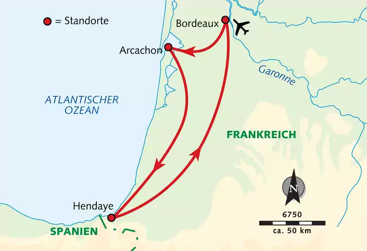 So wohnen wirDie ersten 2 Tage übernachten wir im kleinen Hotel Bleu de Mer (2*, 21 Zimmer) im Herzen der Altstadt von Bordeaux. Es liegt in einer verkehrsberuhigten Gasse, nur 2 Gehminuten von der Flusspromenade entfernt. Die Zimmer verfügen über Klimaanlage, TV, Föhn und WLAN. Die folgenden 3 Tage wohnen wir in Arcachon im gemütlichen Hotel Orange Marine (2*, 21 Zimmer), jeweils 3 Gehminuten vom Strand, Jachthafen, Cafés und Geschäften entfernt gelegen. Die einfach eingerichteten Zimmer sind mit Klimaanlage, TV, Föhn und WLAN ausgestattet und verteilen sich um einen palmenbestandenen Patio. Die letzten 5 Tage verbringen wir im traditionsreichen Familienhotel Bergeret Sport (3*, 20 Zimmer) in Hendaye. Das im baskischen Stil erbaute Haus liegt in einer ruhigen Seitenstraße, 3 Gehminuten vom Strand und in unmittelbarer Nähe zu Cafés und Geschäften. Die individuell eingerichteten Zimmer verfügen über Klimaanlage, TV, Föhn, Safe und WLAN. In Bordeaux nehmen wir das Abendessen auswärts ein, in Arcachon und Hendaye in den jeweiligen Hotels.