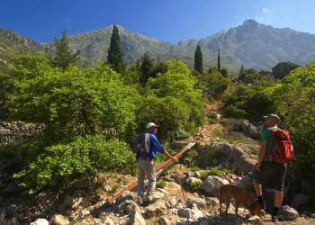 3. Tag: Auf Hirtenpfaden im KüstengebirgeKurzer Transfer nach Old Dhërmi. Nun folgen wir einem alten Hirtenpfad in eine Schlucht hinauf, die uns zu den Hängen des Ceraunischen Gebirges führt. Bald erreichen wir einen Pass, der uns ein schönes Panorama auf das Küstengebirge gewährt. Am Kloster Stravidhit vorbei steigen wir nach Ilias und zum Strand von Gjipe ab (GZ: 4 Std., + 500 m, - 450 m). Nach einer ausgiebigen Strandpause fahren wir nach Dhërmi zurück.