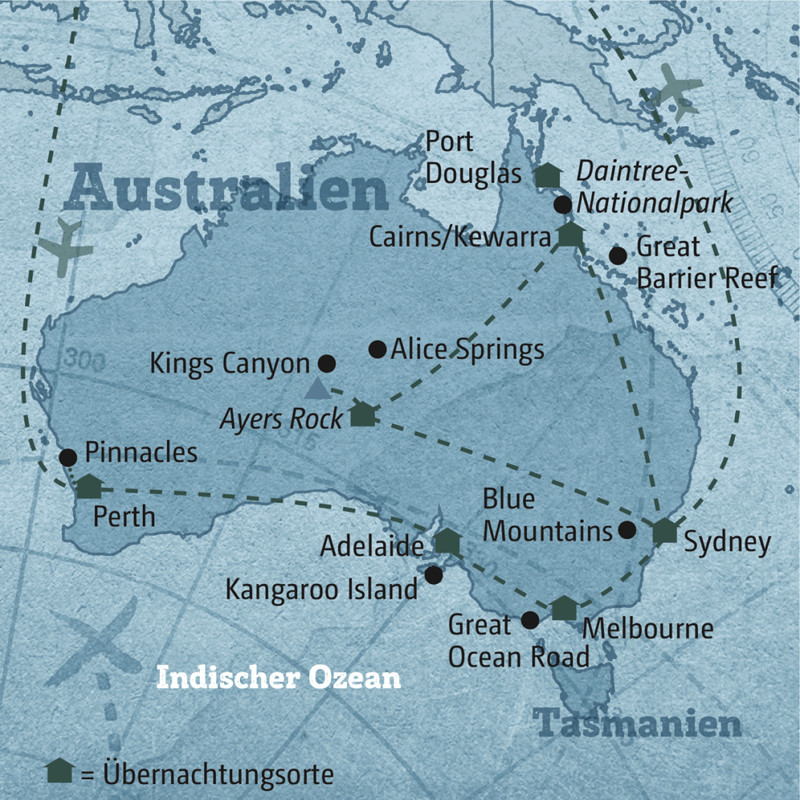 Die Idee dieser Reise: die perfekte Einsteigertour für alle, die das erste Mal in Australien sind. Der Routenvorschlag unserer Länderexpertin führt Sie u. a. in die Metropolen Melbourne und Sydney, mitten in die Wüste zum Ayers Rock und zum Great Barrier Reef, dem berühmtesten Tauchspot der Welt. Mehr als 3500 Lokale machen MELBOURNE, übrigens seit Jahren als lebenswerteste Stadt der Welt ausgezeichnet, zum Mekka für Feinschmecker. Ihr Scout lotst Sie durch die verwinkelten Laneways zu seinem Lieblingsrestaurant. Schon mal Kängurufleisch oder Buschbanane probiert? Um den ULURU, Australiens Wahrzeichen im Outback, ranken sich viele Legenden aus der Traumzeit. Nehmen Sie bloß keine Steine als Souvenirs mit. Das stört die Ruhe der Geister – und Ihnen bringt es Unglück! Gleicher Kontinent, andere Welt: das GREAT BARRIER REEF. Es ist das größte Korallenriff der Welt. Zwischen Nemo & Co. zu tauchen – einen schöneren Urlaubsausklang kann ich mir nicht vorstellen!