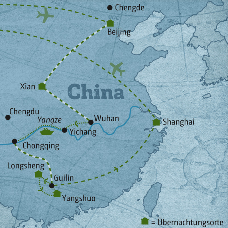 Die Idee dieser Reise: neben den Megacitys Beijing und Shanghai die sagenhaften Landschaften Chinas kennenlernen. In diesen Routenvorschlag hat unsere Asien-Expertin nicht nur den Yangze integriert, sondern auch die Reisterrassen von Longsheng und eine Floßfahrt auf dem Yulong-Fluss. Beijing, Große Mauer, Terrakotta-Armee – gleich zu Anfang jagt ein Highlight das andere. Als totale Entspannung empfand ich dann die Kreuzfahrt auf dem YANGZE. Beim Durchqueren der Drei Schluchten laden die grünen Wälder an den Berghängen ringsum zum Träumen ein - ein einzigartiges Erlebnis. Ebenfalls magisch sind die Reisterrassen von LONGSHENG, eine kleine Wanderung oder Radtour durch die einzigartige Landschaft ist ein Muss. Für mich ein unvergesslicher Moment: Wenn die ersten Sonnenstrahlen am Morgen das Grün in hundert Schattierungen leuchten lassen.