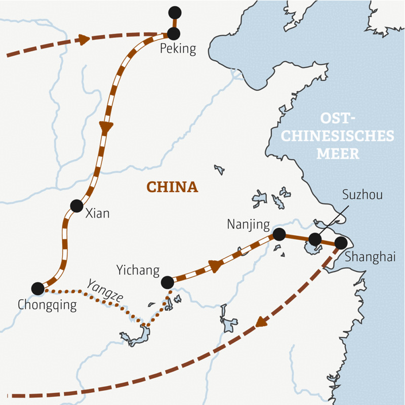 Zum Himmelstempel und der Verbotenen Stadt gesellt sich die Terrakotta-Armee – stramm wie eh und je bewachen die lebensgroßen Krieger das Grab des ersten chinesischen Kaisers. Neben Pagoden und Tempeln wachsen Wolkenkratzer in den Himmel. Der Drei-Schluchten-Staudamm hat den Yangze verändert, dennoch zählt die Flusskreuzfahrt nach wie vor zu den schönsten Erlebnissen im Reich der Mitte.