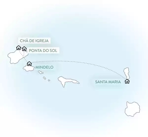 Einzigartig über dem Atlantik - Unsere 11 Übernachtungen verteilen sich auf nur 4 Standorte auf 3 Inseln. 4 Nächte verbringen wir auf Santo Antão. Davon jeweils 2 in Ponta do Sol und Chã d´Igreja. 3 Nächte wohnen wir auf São Vincente in der Hafenstadt Mindelo und 4 Nächte* verbringen wir direkt am Strand auf Sal in Santa Maria. *Bei Flugbuchung über Wyldaway reduziert sich der Aufenthalt auf Sal aufgrund der Flugzeiten auf 3 Nächte. Das Hotelzimmer kannst du bis zur Abfahrt am späten Abend nutzen