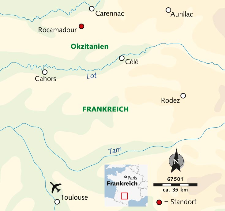 1. Tag: Bonjour, Quercy!Flug nach Toulouse. Gemeinsamer Bustransfer durch eine grüne hügelige Landschaft und über die Kalkplateaus des Quercy nach Rocamadour (ca. 2 Std.).