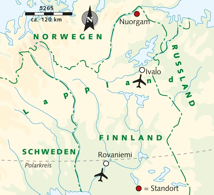 So wohnen wirHotel: Umgeben von spektakulären Landschaften, haben unsere Gastgeber Marjatta und Raimo mit dem Nuorgam Holiday Village ein kleines Paradies für Ruhesuchende geschaffen. Luxus suchst du hier vergeblich, doch fühlst du dich sofort zu Hause. Es gibt ein Restaurant mit angeschlossenem Café. In der Bar/Lounge kannst du in entspannter Atmosphäre einen Drink genießen. Am Flußufer gibt es eine Sauna, der Besuch für uns 2 x inklusive. WLAN steht in den öffentlichen Bereichen kostenfrei zur Verfügung. Zimmer: Wir übernachten in zweckmäßig ausgestatteten Ferienwohnungen/Apartments, die mit Bad oder Dusche/WC sowie einer kleinen Küche ausgestattet sind. Je zwei Einzelzimmer befinden sich in den größeren Ferienwohnungen/Apartments und teilen sich ein gemeinsames Bad. Verpflegung: Morgens bedienen wir uns am Frühstücksbüfett. Das ausgezeichnete Abendessen mit lokalen Spezialitäten wird entweder als Drei-Gang-Menü oder in Büfettform im Restaurant der Ferienanlage serviert. Lage: Nuorgam ist ein kleines Dorf mit 400 Einwohnern und bescheidener Infrastruktur, ganz im Norden Finnlands und in unmittelbarer Nähe zur norwegischen Grenze gelegen. Die nächstgrößere Gemeinde Utsjoki ist ca. 45 km entfernt.