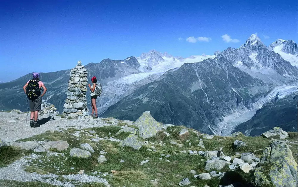 7. Tag: Grand Balcon SudBusfahrt zum Col des Montets am Ende des Chamonix-Tals. Wir wandern am Südbalkon, auf der gegenüberliegenden Seite zeigen sich berühmte Gipfel wie Petit Dru, Grandes Jorasses und natürlich der "Monarch" selbst, der Mont Blanc. Das allerschönste Panorama genießen wir am Ufer des kleinen Lac des Cheserys, in dem sich das halbe Mont-Blanc-Massiv spiegelt, einfach grandios! Abstieg ins Chamonix-Tal und Fahrt nach Les Contamines (1 Ü).