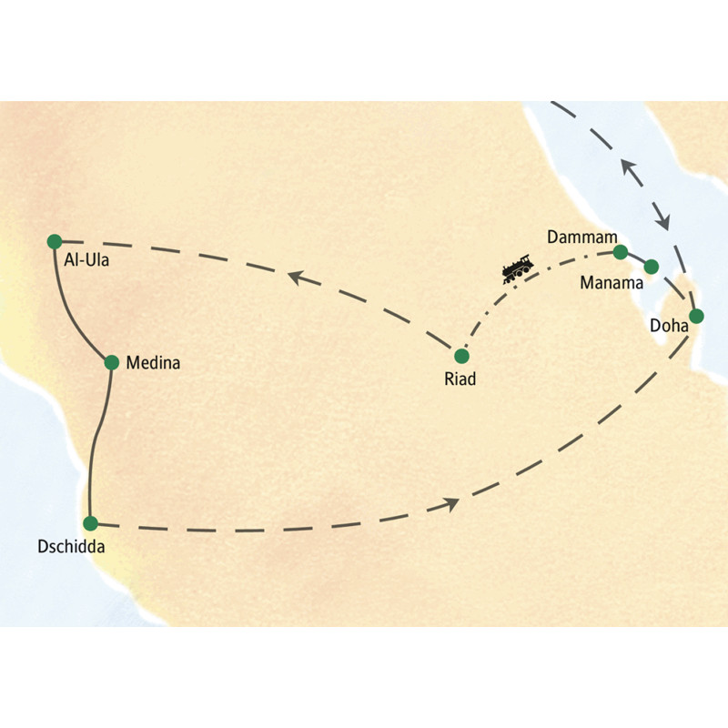 Es gibt viel zu entdecken in den Schatzkammern Bahrains, Saudi-Arabiens und Katars! Kommen Sie mit ins weite Wüstenland, wo uralte Kultur moderner Dynamik begegnet. Wir versenken uns in die geheimnisvollen Felszeichen am Jabal Ikmah und genießen das buchstäblich elefantöse Farbenspiel der Nachmittagssonne in der Felsenlandschaft. Sogar die Atmosphäre der Prophetenmoschee in Medina können wir erspüren. Ein Fest der Gastfreundschaft erwartet uns in Diriyah, dem historischen Teil von Riad, der Duft von Weihrauch in den Souks, spektakuläre Skylines in Manama und Doha, mondäne Eleganz auf künstlichen Inseln.