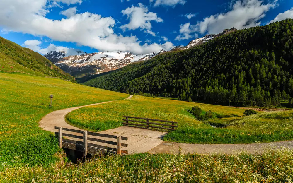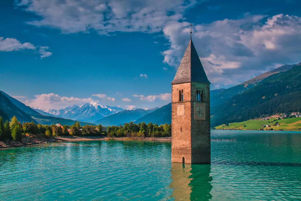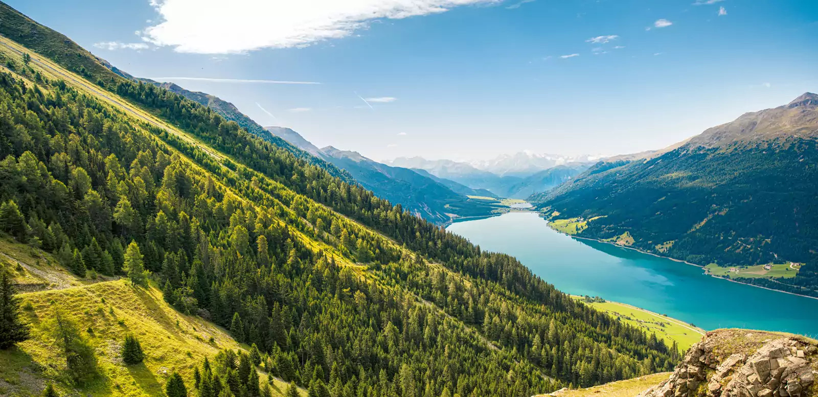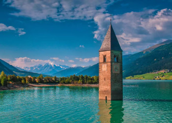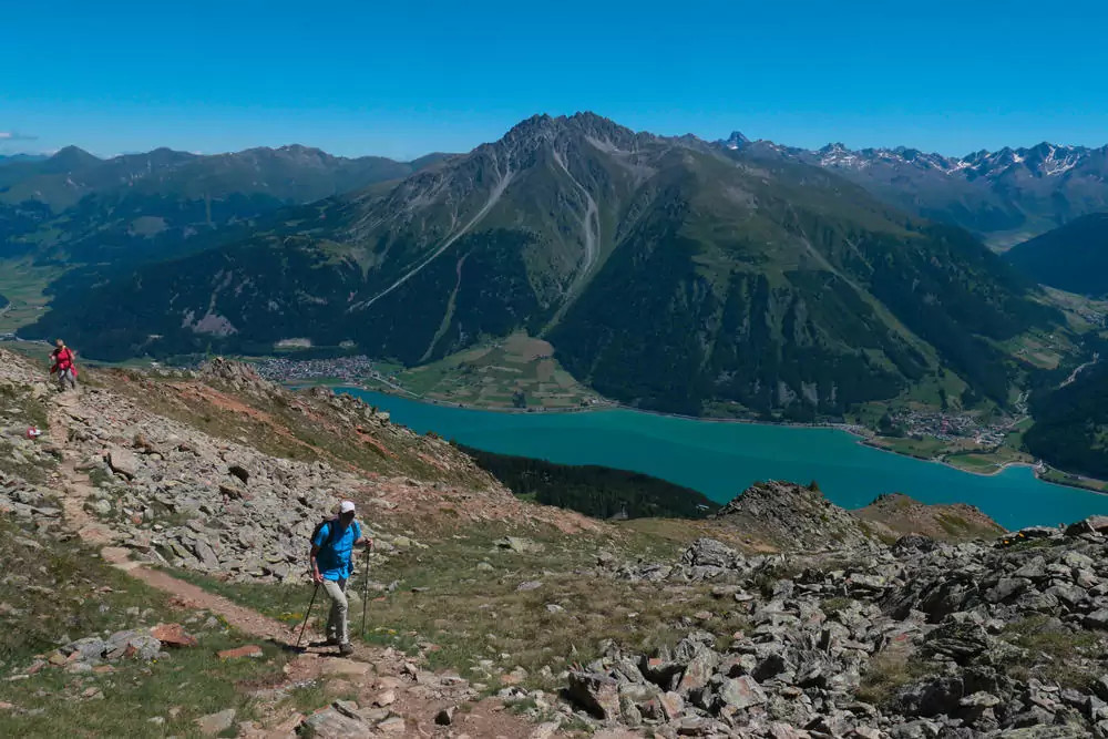 3. Tag: Zum Aussichtsberg ZehnerkopfItalien: Hoch über dem Reschensee ragt der Zehnerkopf in den blauen Himmel. Von der Bergstation der Höllentalbahn machen wir uns auf den Weg zu seinem Gipfel. Und schon glitzern der Reschensee und die Ötztaler Gletscherriesen mit der Weißkugel (3.738 m) und der Weißseespitze (3.498 m) in der Sonne – was für ein Anblick! Auf dem schön angelegten Panoramaweg steigen wir zur Haideralm ab und nehmen die Seilbahn ins Tal (GZ: 4 1/2 Std., + 500 m, - 450 m).