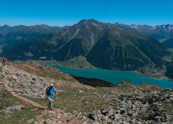 6. Tag: Nauderer HöhenwegÖsterreich/Italien: Mit der Bergkastelseilbahn fahren wir zur Bergstation und wandern auf dem Nauderer Höhenweg, der für sein Ortler-Panorama bekannt ist. Doch die schönste Aussicht erwartet uns am Plamort-Felsen: Im Vordergrund breitet sich der Reschensee aus, im Hintergrund malen sich die Gipfel des Ortlers, der Königsspitze und des Monte Cevedale in den Himmel, herrlich! Abstieg nach Graun und Transfer nach Nauders (GZ: 3 Std., + 50 m, - 700 m).