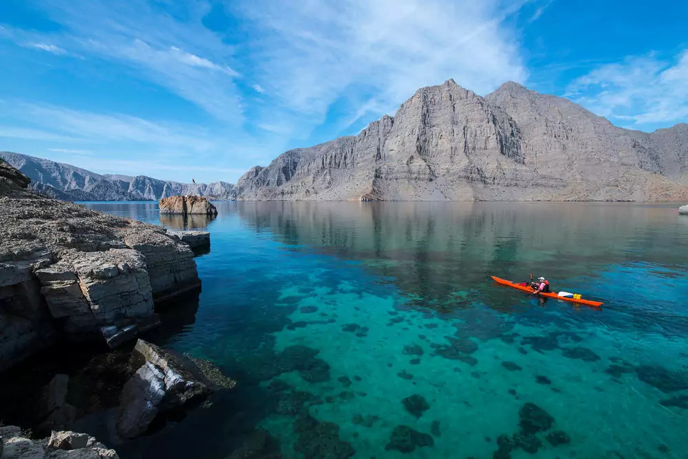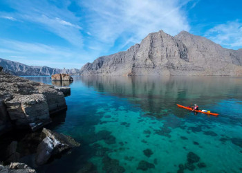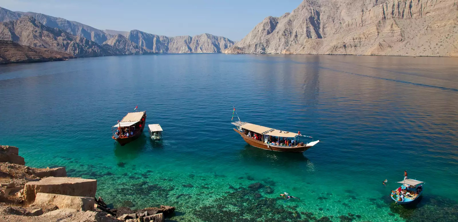 5. Tag: Per Dhow durch die Arabischen FjordeLeinen los! Heute steht uns eine Dhow, ein traditionelles omanisches Boot, exklusiv zur Verfügung für eine ganztägige Fahrt durch Meeresarme, die von schroffen Bergen umringt sind – willkommen in der arabischen Fjordlandschaft. Von menschlichen Siedlungen fehlt schnell jede Spur. Dafür lohnt es sich, Ausschau nach geselligen Meeresbewohnern zu halten. Die Chance, Delfine zu sehen, ist hier ziemlich hoch. Im kristallklaren Wasser können wir schwimmen, schnorcheln und Kajak fahren (Kajaks an Bord inklusive). Wir machen Halt auf Telegraph Island, wo noch Relikte einer Telegraphenstation aus dem 19. Jahrhundert zu finden sind, und unternehmen auf der kleinen Insel Seebi eine kurze Wanderung zu einem Aussichtspunkt. GZ ca. 1 Stunde. (F, M)