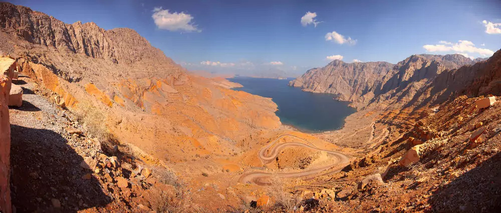 4. Tag: Abenteuer Hajar-GebirgeWie ein Halbmond zieht sich das Hajar-Gebirge vom Osten Omans über die VAE bis nach Musandam und prägt enorm das Erscheinungsbild der kleinen Halbinsel. In Geländefahrzeugen machen wir uns auf zu den schönsten Ecken dieser zerklüfteten Landschaft. Vom Aussichtspunkt Khor Najd genießen wir einen beeindruckenden Panoramablick auf das Arabische Meer. Bergflanken ragen hier von beiden Seiten aus dem Wasser. Am Wadi Ain unternehmen wir eine erste Wanderung, die uns an Felsformationen vorbei zu einem Wasserfall führt. GZ ca. 2 Stunden. Schließlich fahren wir hoch zum fruchtbaren Sayh-Plateau und nähern uns dem Gipfel des Jebel Al Harim, dem höchsten Berg in Musandam. Unterwegs halten wir Ausschau nach versteinerten Fossilien, die bis zu 250 Millionen Jahre alt sind. 120 km. (F, M)
