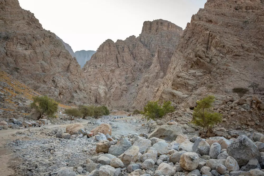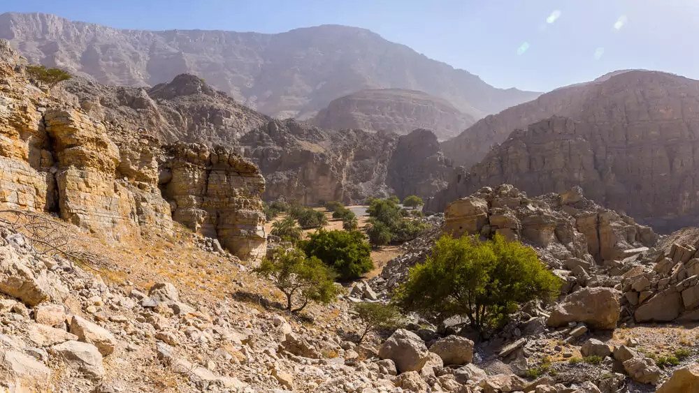 6. Tag: Jebel JaisNach einer gut einstündigen Fahrt erreichen wir mitten im Hajar-Gebirge die Grenze zurück in die VAE. Kurz darauf können wir schon einen Blick auf den Jebel Jais werfen. Mit 1.934 m ist er der höchste Berg des Landes. An einem seiner Hänge unternehmen wir unsere längste Wanderung. Unser Ziel heißt Wadi Shehah, ist jedoch besser bekannt unter dem poetischen Namen „Versteckte Oase“ – und der trifft es ziemlich gut, handelt es sich doch um eine mit Palmen gesäumte Lichtung inmitten von steilen Bergkanten. Der Pfad führt vorbei an Akazienbäumen und verschlafenen Bergdörfern und bietet immer wieder herrliche Panoramen über die Gebirgslandschaft. GZ ca. 4 Stunden. Am Nachmittag lassen wir die Berge hinter uns und fahren weiter an die Küste. 1 Hotelübernachtung bei Ra’s al-Chaima. 134 km. (F)