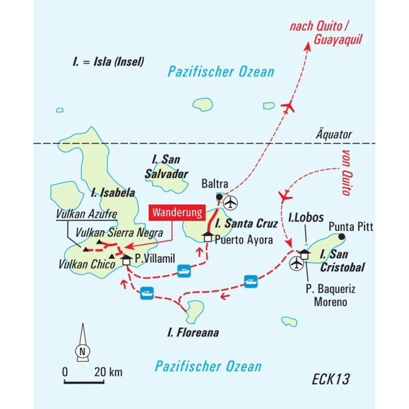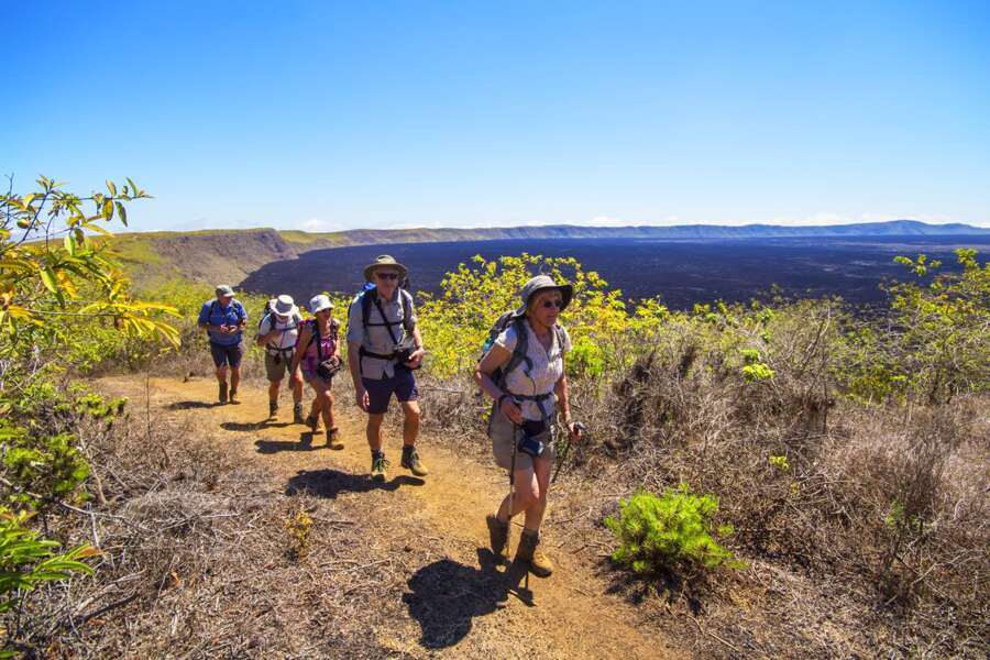 Wanderreise auf den Inseln San Cristóbal, Isabela und Santa CruzTiere, Tiere, überall Tiere. Eine in rosa- und türkistönen gefärbte Meerechse mit ihrem aufstehenden Kamm ruht sich im Schatten der Palmenbäume aus. Überall wuseln rote Klippenkrabben über die schroffen Felsen. Seelöwen sonnen sich neben uns am gelbkörnigen Strand und schwimmen mit uns um die Wette. Kaum ein Archipel ist kontrastreicher als die Galápagos-Inseln. Schwarze, brandungsumtoste Lavaküsten stoßen auf geheimnisvoll verhangene Nebelwälder sowie eine großteils endemische Tier- und Pflanzenwelt. Über all dem schwebt der Zauber einer ungezähmten Natur. Wir sind zu Fuß unterwegs und wandern durch die zerklüftete, trockene Vulkanlandschaft. Am Vulkan Chico steigt Dampf aus Fumarolen auf. Wir wandern über die sanften grünen Hügel entlang des Vulkankraters Sierra Negra und genießen den Blick über den schwarzen, fast 11 Kilometern breiten Krater. Ein kurzer, einfacher Abstieg führt uns zum Lavagestein. Der tiefer gelegene Vulkan Azufre mit seinen bunt gefärbten Wänden zieht uns in seinen Bann. Das Besondere an dieser Reise ist, dass wir nachhaltig direkt auf den Inseln übernachten und kleine Betriebe vor Ort unterstützen und nicht mit einem der vielen Kreuzfahrtschiffe unterwegs sind. So lernen wir diese einzigartige Inselwelt mit seinen kleinen Dörfern auch nach Abreise der Tagestouristen ganz entspannt kennen. Zwischen spannenden Entdeckungen finden wir auf dieser Reise Zeit, Riesenschildkröten aus nächster Nähe zu beobachten, die Unterwasserwelt bei Schnorcheltouren zu erkunden und an den wunderschönen Sandstränden zu entspannen.