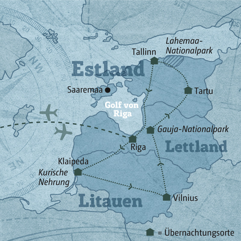 Die Idee dieser Reise: Nehmen Sie das Steuer selbst in die Hand und entdecken Sie Estland, Lettland und Litauen im eigenen Tempo. Der Routenvorschlag unserer Länderexpertin führt Sie in die drei Hauptstädte Tallinn, Riga und Vilnius, gewährt Ihnen aber auch Einblicke in unberührte Natur und das Leben auf den Dörfern. In der alten Hafenstadt Klaipeda setzen Sie mit der Fähre zur KURISCHEN NEHRUNG über. Genießen Sie den Sonnenuntergang auf den Dünen. Ein weiteres landschaftliches Highlight: der GAUJA-NATIONALPARK mit seinen Grotten, Höhlen, Seen und Kreuzritterburgen. Ebenfalls einen Stopp wert: das SCHLOSS RUNDALE – in "Lettlands Versailles" fühlen Sie sich in die Zeit des französischen Sonnenkönigs zurückversetzt. Beim Sightseeing in Vilnius zeigt Ihnen Ihr Scout nicht nur die Sehenswürdigkeiten, sondern verrät auch, wo man besonders gut die Spezialität "Cepelinai" essen kann.