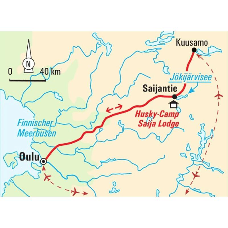 - Lokale, englischsprachige Reiseleitung ab/bis Taivalkoski<br>Linienflug mit Lufthansa (Economy, Tarifklasse L) von Frankfurt nach Kuusamo und zurück, nach Verfügbarkeit<br>Förderung eines Klimaschutzprojektes von atmosfair<br>Flug-/Sicherheitsgebühren (ca. 105 €)<br>Rail & Fly-Fahrkarte in Deutschland und Österreich<br>Übernachtung 7 x in der Saija Lodge, davon 1 x in einem Iglu, wer möchte (wetterabhängig)<br>Vollpension<br>Leihausrüstung: (Ski-)Overall, (Ski-)Stiefel, Handschuhe, Sturmhaube, Fellmütze, Winterboots<br>Reisekrankenschutz<br>