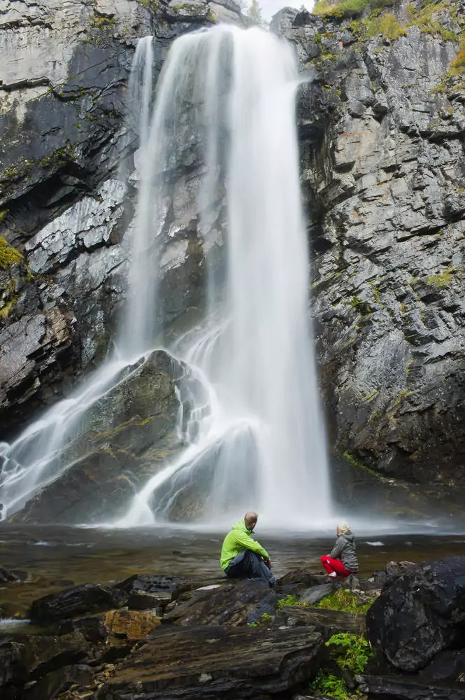 2. Tag: Veslefjell und Myfall1-2 Stiefel: Vom Hotel aus wandern wir auf das Veslefjell, einen Bergrücken mit weitem Rundumblick. Von dort geht es hinab zum Myfall, einem mehr als 100 m hohen Wasserfall mit drei Fallstufen (GZ: 4 Std., +/- 220 m). 2-3 Stiefel: Wie bei der leichteren Tour wandern wir über das Veslefjell zum Myfall. Von dort geht es aufwärts durch Wald auf das Kyrkegardsfjell, dessen Kamm wir auf gesamter Länge erwandern (GZ: 5 1/2 Std., +/- 240 m).