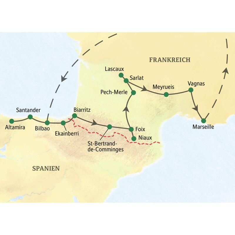 Eine Reise zu den Anfängen der Kunst: Tauchen Sie ein in die Welt der Eiszeitkünstler – in weltberühmten Höhlen oder in ihren perfekten Repliken wie Altamira oder Lascaux, und auch die weniger bekannten überraschen mit atemberaubenden Höhlensystemen und Malereien. Über Tage erwartet Sie so manches Highlight: die Strandpromenade von Biarritz, die Altstadtgassen von Sarlat und die wunderbare Küche des Périgord.