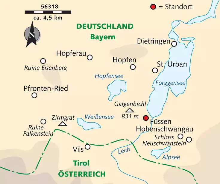 4. Tag: Schwan- und AlpseeDirekt vom Hotel geht es auf den Kalvarienberg. Der Blick auf Füssen ist unvergleichlich. Bei Schwan- und Alpsee nähern wir uns den Königsschlössern. Die wahnsinnigen Grün- und Blautöne des Alpsees lassen uns zweifeln – ist das noch Deutschland oder ein brillianter Bergsee in Kanadas Rockies (GZ: 4 Std., +/- 120 m).