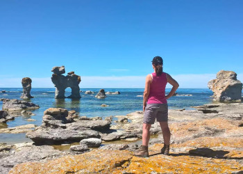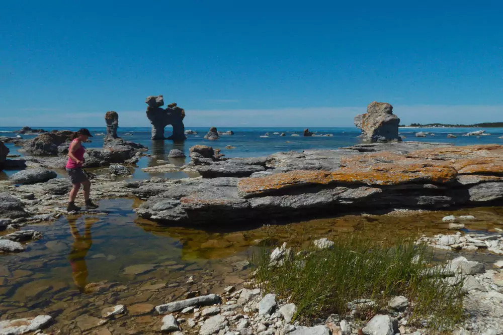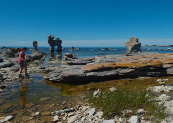 7. Tag: Fårö – Raukar & KaribikstrandMit dem Bus geht es auf die Insel Fårö. Bei Langhammar wandern wir durch ein Labyrinth der bizarr geformten Raukar. In Helgumannen bestaunen wir das schönste Fischerdorf Fårös. Vom Café Lauter geht es zu Fuß zum "Hund". Wie das Haustier eines Riesen steht dieser eindrucksvolle Felsen mitten im Meer (GZ insgesamt: 2 Std., kaum Höhenunterschiede). Am Sudersand entscheidet das Wetter: Fühlen wir uns wie auf Sylt oder eher karibisch?