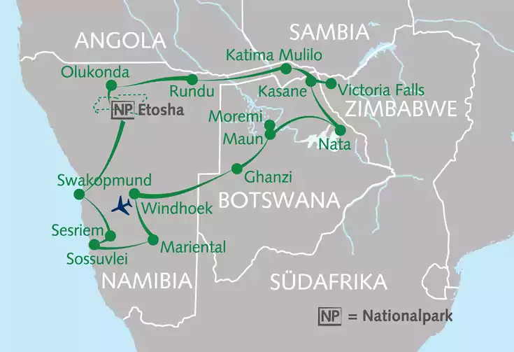 Von den beeindruckenden Nationalparks Botswanas über die majestätischen Victoriafälle in Simbabwe bis hin zur weiten Wüste Namibias gibt es viel zu entdecken. Bei unserer Rundreise durch die faszinierenden Landschaften dieser drei Länder erleben wir die spannende Tierwelt hautnah – an Land bei Pirschfahrten oder vom Fluss aus bei Bootstouren. Wir übernachten unter Millionen von Sternen in der Wüste und erwandern die Dünen von Sossusvlei. Lass uns gemeinsam in die unglaubliche Natur des südlichen Afrikas eintauchen!