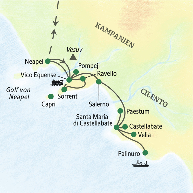 Der Golf von Neapel – ein Fest für alle Sinne: Kommen Sie mit ins antike Pompeji, nach Neapel, ins quirlige Salerno! Besuchen Sie Familie de Crescenzo auf ihrem Agriturismo und probieren Sie selbst gemachte Antipasti. Genießen Sie den Duft der Macchia im Nationalpark Cilento. Kurven Sie über die angeblich berühmteste Küstenstraße der Welt vorbei an Amalfi und nach Ravello. Bei atemberaubendem Blick von der Terrasse der Villa Cimbrone stoßen wir aufs Leben an. Dazu die Tempel und Fresken von Paestum und eine Bootsfahrt um Palinuro. Und immer wieder Zeit fürs Dolcefarniente.