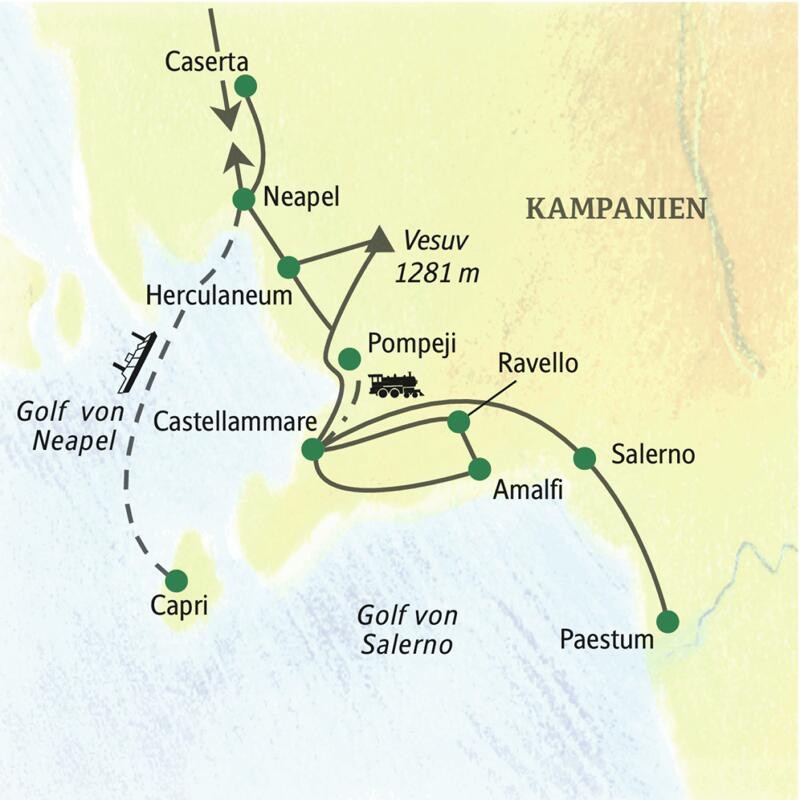Griechische Tempel, komplette römische Städte und Villen, barocke Palazzi und gegenwärtiges Leben - quer durch alle Jahrhunderte führt uns diese klassische Studiosus-Reise mit Tiefgang von Neapel bis Paestum. Neben den Highlights am Golf von Neapel wie Pompeji, Vesuv, Capri und Amalfitana haben wir manches Kleinod und immer wieder kleine Überraschungen für Sie ausgewählt. Genießen Sie von der Villa Axel Munthes in Anacapri den Weitblick aufs Meer und die Insel oder diskutieren Sie mit einem Insider über Maßnahmen gegen die Mafia. Und lassen Sie mit einem Limoncello den Tag auf der Terrasse unseres Hotels am Meer ausklingen!