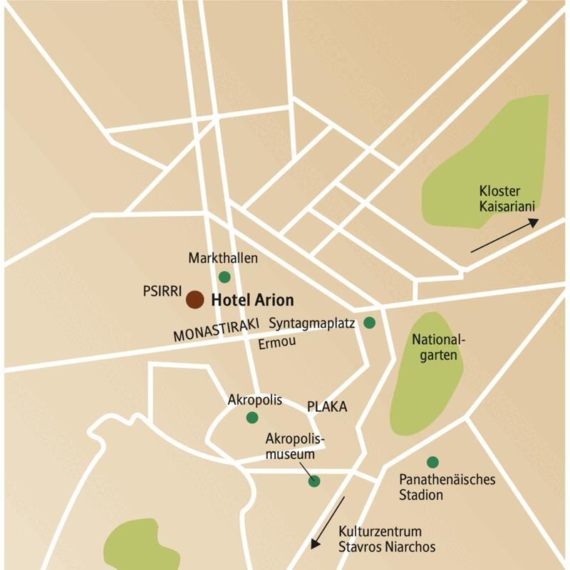 Athen, Hotel Arion***Das kleine und einfache Hotel liegt in einer ruhigen Nebenstraße des quirligen Kneipen- und Tavernenviertels Psirri. Ganz in der Nähe befinden sich die Markthalle, die Fußgängerzone Ermou und die Altstadt Plaka. Von der nahen Station Monastiraki aus können Sie Athen auf eigene Faust mit der U-Bahn erkunden. Das Hotel verfügt über ein kleines Frühstücksrestaurant und einen gemütlichen Aufenthaltsraum. WLAN (kostenfrei) steht im gesamten Hotel zur Verfügung. Die 51 Zimmer sind mit Klimaanlage, Sat.-TV, Safe und Föhn ausgestattet. Einzelzimmer sind Doppelzimmer zur Alleinbenutzung. Ein Besuch der Dachterrasse mit Blick auf Athen und die Akropolis ist der ideale Abschluss eines erlebnisreichen Tages in der griechischen Hauptstadt.