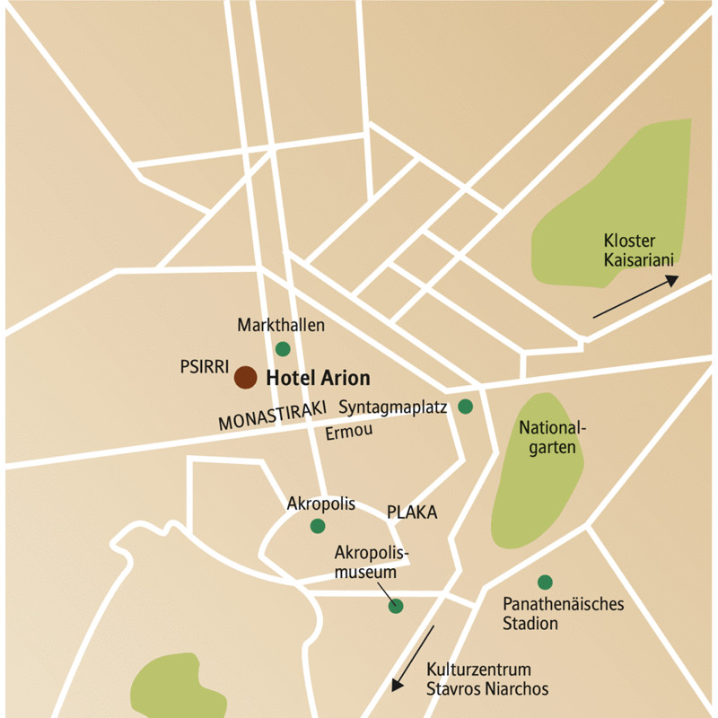 Athen, Hotel Arion***Das kleine und einfache Hotel liegt in einer ruhigen Nebenstraße des quirligen Kneipen- und Tavernenviertels Psirri. Ganz in der Nähe befinden sich die Markthalle, die Fußgängerzone Ermou und die Altstadt Plaka. Von der nahen Station Monastiraki aus können Sie Athen auf eigene Faust mit der U-Bahn erkunden. Das Hotel verfügt über ein kleines Frühstücksrestaurant und einen gemütlichen Aufenthaltsraum. WLAN (kostenfrei) steht im gesamten Hotel zur Verfügung. Die 51 Zimmer sind mit Klimaanlage, Sat.-TV, Safe und Föhn ausgestattet. Einzelzimmer sind Doppelzimmer zur Alleinbenutzung. Ein Besuch der Dachterrasse mit Blick auf Athen und die Akropolis ist der ideale Abschluss eines erlebnisreichen Tages in der griechischen Hauptstadt.