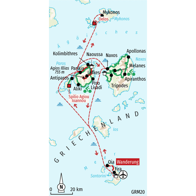 Mit dem Trekkingbike unterwegs auf Paros - Antiparos - Naxos - SantorinDie Kykladen sind der Inbegriff der griechischen Inselwelt. Vier der schönsten Inseln erkunden wir mit dem Trekkingbike, jede unverwechselbar und doch typisch für das, was die Kykladen so faszinierend macht: Weiß gekalkte verwinkelte Häuser, karge Gebirgszüge mit grünen und blühenden Tälern, tiefblaues Meer unter wolkenlosem Himmel, feinsandige Strände und viele Zeugnisse griechischer Kunst und Kultur. Beeindruckt von der Natur der traumhaften Ägäis genießen wir auch die gute mediterrane Küche mit ihren vielen frischen Zutaten und vor allem die herzliche griechische Gastfreundschaft der traditionsverbundenen Einwohner. Und wir erleben eine abwechslungsreiche Reise: Malerische Kulissen aus weißen Fischerdörfern, Klöstern und Kirchen auf Paros und Antiparos, herrliche Panoramastrecken auf der größten Kykladeninsel Naxos und eine wunderschöne Wanderung am Steilrand des Kraters auf Santorin. Zwischendurch laden schattige Olivenbäume uns zur Siesta ein und traumhafte Strände zu einem Bad im türkisblauen Meer. Von der griechischen Sonne verwöhnt, lassen wir abends bei einem Ouzo die Tage Revue passieren. Griechenland von seiner schönsten Seite, Meerblick inklusive!