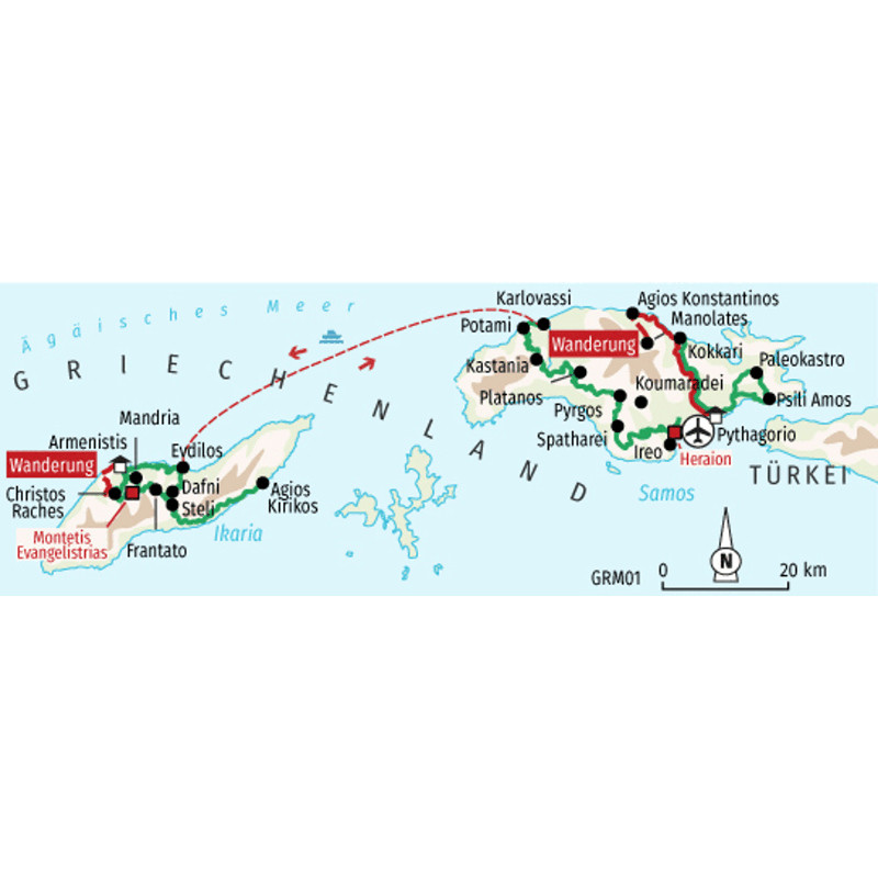 Trekkingrad oder E-Bike Reise über die grünsten Inseln der ÄgäisWunderschöne Sandstrände und Buchten, unberührte Zypressen–, Steineichen- und Pinienwälder, wasserreiche Täler, glasklare Gebirgsbäche, immergrüne Weinberge, einsame Klöster und idyllische Bergdörfer. Entdecken sie die "grünen Perlen" der Ägäis per Bike über wunderschöne aussichtsreiche Panoramastraßen und idyllische Pisten. In urigen Tavernen mit Weitblick ins Bergland oder abends am Hafen genießen Sie die köstliche griechische Küche und Gastfreundschaft. Nach erlebnisreichen Radtagen laden wunderschöne Strände und Buchten mit glasklarem Wasser zum Seele baumeln ein. Samos seit vielen Jahren berühmt für seine vielfältigen Naturschönheiten und Ikaria, die Unberührte, kaum Entdeckte - zwei der schönsten Ägäisinseln, kombiniert in einem Programm, erwarten Sie.