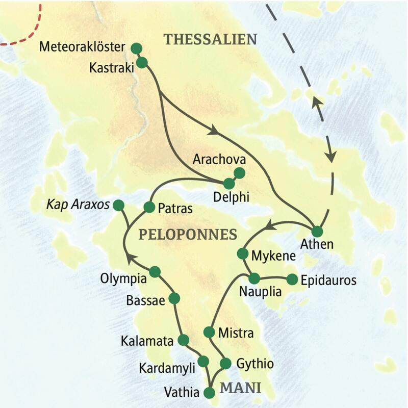 Silbrig glitzernde Olivenhaine, dichte Wälder und der würzige Duft von Salbei und Thymian am Wegesrand – in den archaischen Bergwelten Arkadiens, im Parnass oder auf der wilden Mani, im ursprünglichen Süden des Peloponnes, spüren wir auf stillen Wanderpfaden die Seele Griechenlands. Wir entdecken auf dieser Wanderreise aber auch antike Stätten wie Delphi und Olympia, wo Natur und Kultur aufs Schönste verschmelzen, und nähern uns auf leisen Sohlen den Meteoraklöstern, die zwischen Himmel und Erde zu schweben scheinen. Griechenlands Gegenwart begegnet uns auf einer Street-Art-Tour in Athen, und bei Tavernenessen oder beim Strandpicknick unter schattigen Pinien schnuppern wir mediterrane Lebensart.