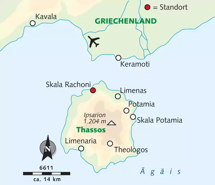 So wohnen wirHotel: Die kleine, gepflegte Drei-Sterne-Anlage Aegean Sun mit 32 Studios und Apartments bietet eine Rezeption, einen Frühstücksraum sowie eine Bar. Am Swimmingpool und Strand stehen Liegen und Sonnenschirme kostenfrei zur Verfügung. Zimmer: moderne Studios mit Wohn-/Schlafraum, Kitchenette (Kühlschrank, Mikrowelle, Kaffeemaschine, Wasserkocher), Sat-TV, WLAN, Klimaanlage, Mietsafe, Telefon, Föhn, Balkon oder Terrasse. Verpflegung: Das Frühstück nehmen wir im Hotel ein, zum Abendessen gehen wir in verschiedene Tavernen. Lage: In der fruchtbaren Küstenregion im Nordwesten der Insel, umgeben von Kiefernwäldern und Olivenhainen, liegt der kleine Urlaubsort Skala Rachoni mit seinem traditionellen Hafen, einem langen Sand-/Kiesstrand sowie einigen Tavernen und Cafés. Das Hotel liegt etwa 800 m außerhalb zwischen Olivenhainen und dem Strand. Einige Tavernen, einen Minimarkt und die Bushaltestelle erreichen wir nach etwa 400 m. Der Inselhauptort Limenas ist ca. 11 km entfernt (20 Min. per Bus) und auch Ausgangspunkt einiger Wanderungen. Sehenswerte Zeugnisse der Antike sowie Geschäfte und Cafés am lebhaften Hafen lohnen einen Besuch.