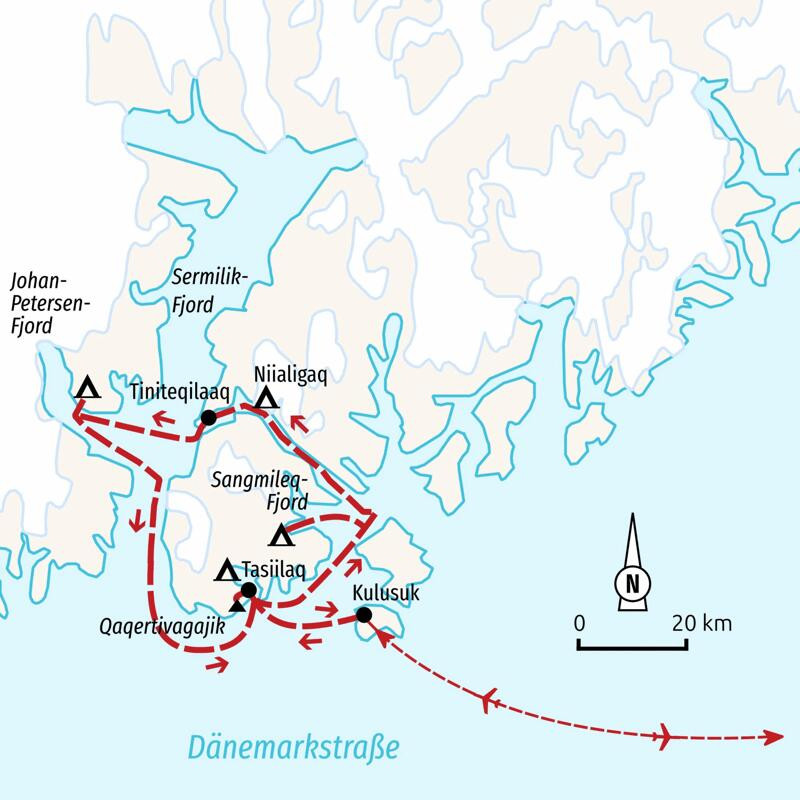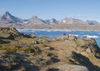 Trekkingreise durch die einsame arktische Naturlandschaft zu den gewaltigen Gletschern OstgrönlandsEine tiefe, wohltuende Ruhe liegt über der majestätischen Landschaft. Zwischen endlosen Ebenen und mächtigen Bergketten schieben sich gigantische Gletscher hinunter in die breiten Fjorde. Mit einem lauten Donnern verabschieden sich gewaltige Eisbrocken vom Gletscherrand und sorgen für Aktion. Das Wasser setzt sich in Bewegung und beruhigt sich erst wieder, wenn die neugeborenen Eisberge an die Oberfläche zurückkehren. In gleichmäßigem Rhythmus brummen unsere Boote, während wir mit den Inuit immer tiefer in das verzweigte Fjordsystem Ostgrönlands eindringen. Neben uns ziehen die Eisriesen gemächlich dem Nordmeer entgegen und beflügeln mit ihren bizarren Formen unsere Fantasie. Inmitten dieser schroffen Natur schlagen wir unsere Zelte auf und erkunden auf intensiven Tagestouren die beeindruckende Naturlandschaft. Wir wandern über bunte Granitfelsen, queren schroffe Geröllebenen und passieren gelegentliche Altschneefelder. Wir erleben die arktische Blütenpracht, waten durch sprudelnde Bergbäche und kommen den gewaltigen Gletschern ganz nahe. Vom Qaqertivagajik, dem Hausberg von Tasiilaq, genießen wir die Fernsicht über die Fjorde, das Eismeer und die Berggipfel. Vor uns liegt die große Weite. Wir spüren die milden Sonnenstrahlen des arktischen Sommers auf unserer Haut, während wir über grüne Moospolster gehen und uns zwischen flauschigem Wollgras unsere Brotzeit schmecken lassen. Nur das Knacken des Eises unterbricht gelegentlich die Stille, wenn wir den Tag im abendlichen Licht der Mitternachtssonne gemütlich ausklingen lassen.