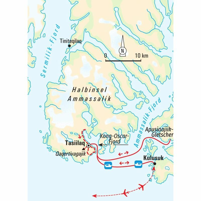 Standort-Wanderreise rund um Ammassalik mit unvergesslichem Erlebnis am Eis in OstgrönlandKalaallit Nunaat, das Land der Menschen, ist fast menschenleer. Die Landschaft gleicht einem Gemälde und nur der Wind weht geräuschvoll durch die absolute Stille. Lautlos dümpeln die Eisschollen durch den Kong-Oscar-Fjord und suchen den Weg ins offene Meer. Die kleinen Holzhäuser von Tasiilaq wirken wie bunte Farbkleckse in dieser endlos weißen Welt. Eines davon ist das Rote Haus von Robert Peroni. Wir wohnen als Gäste bei dem ehemaligen Bergsteiger und machen uns in familiärer Atmosphäre mit der unbekannten Kultur Ostgrönlands vertraut. Wir wandern durch die arktische Landschaft zum Polarstrom und genießen die Aussicht auf die treibenden Eisberge. Wir schnüren unsere Wanderschuhe und steigen auf den Qaqertivagajik, der uns ein Rundumpanorama verspricht. Wir mischen uns in Tasiilaq unters Volk und lernen die Lebensweise der Inuit hautnah kennen. Wir fahren mit Booten durch das Polarmeer und halten dabei Ausschau nach Robben und Walen. Am Rande des Apusiaajiik-Gletschers gehen wir an Land, wandern wie richtige Abenteurer entlang des Gletschers und schlagen für eine Nacht in der endlosen Wildnis unsere Zelte auf. Auf unseren abwechslungsreichen Tagestouren erkunden wir die arktische Natur mit ihren vielen Facetten, tauchen ein in die Kultur und Lebensweise Grönlands und kehren abends in die warme Stube des Roten Hauses zurück. Wir sammeln die Eindrücke wie kleine Mosaiksteinchen, die sich nach unserer Nacht am Gletscher zu einem vollständigen Bild zusammenfügen. Die weißen Momente sind still - aber für immer in unserem Gedächtnis!