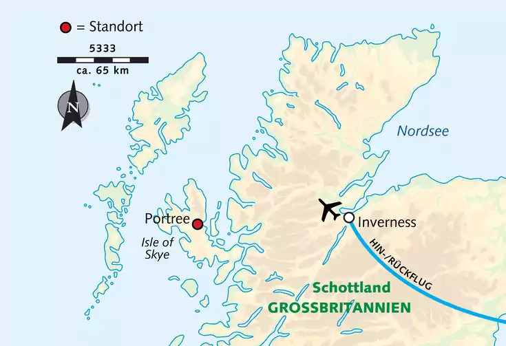 1. Tag: FluganreiseFlug nach Inverness. Transfer zu unserem Hotel in Portree auf der Isle of Skye (ca. 3 1/2 Std.).