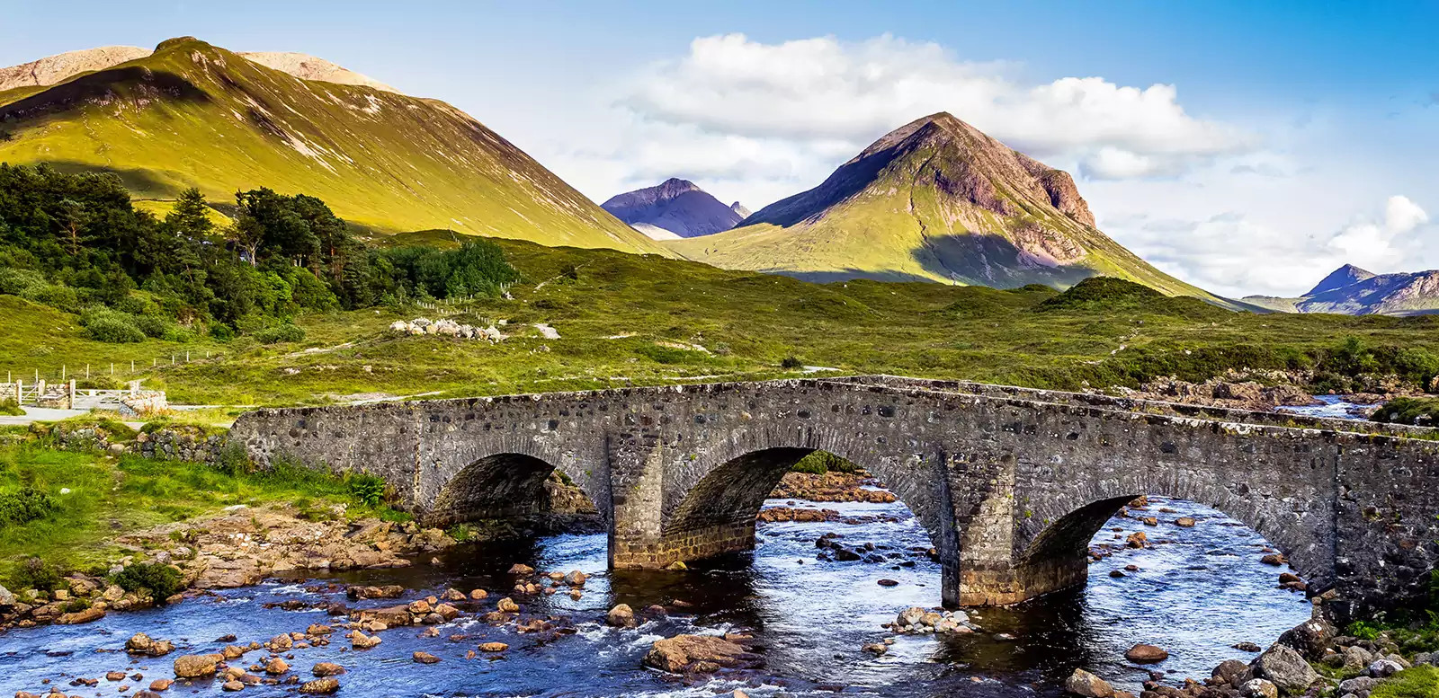 6. Tag: In den Cullin HillsHeute erkunden wir die Cullin Hills, die jedoch keine Hügel sind, sondern eine majestätische wilde Berglandschaft, meist straßenlos und ohne Siedlungen. Unser gut präperierter Schotterweg führt uns am Wasserlauf der Fairy Pools entlang. Wir wandern am Bergrücken auf schmalen Pfaden über feuchte Torfwege. Ein Forstweg durch die Wälder des breiten Tals des gewaltigen Glen Brittle bringt uns schließlich zum Meer. Der breite Strand lädt dazu ein, die Schuhe auszuziehen und das kühle Meerwasser zu genießen (GZ: 5 1/2 Std., + 450 m, - 540 m).
