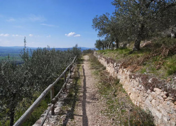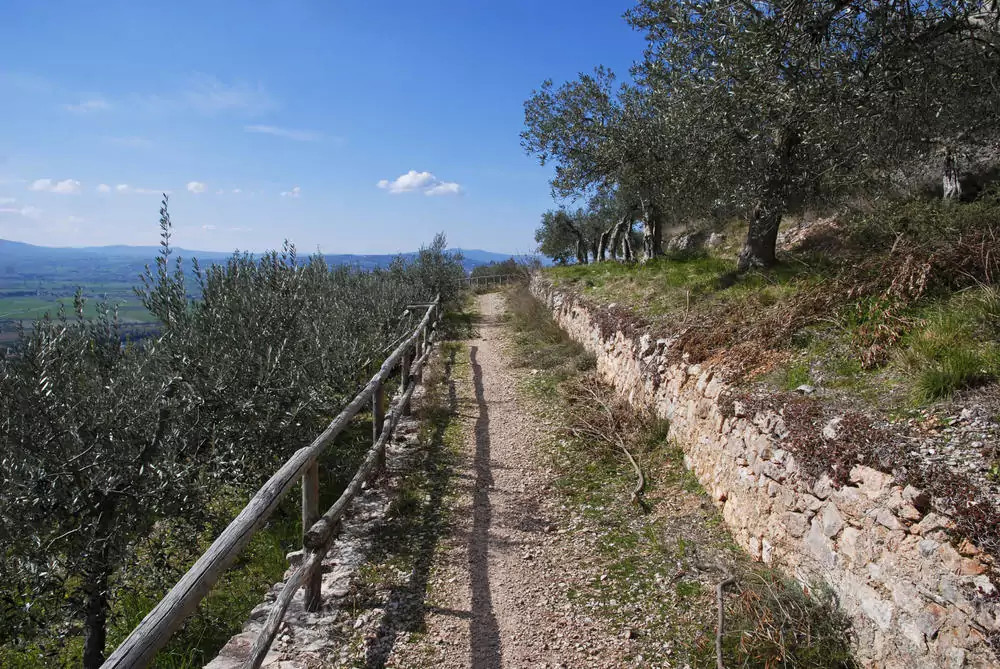 3. Tag: Wanderung durch den heiligen HainDirekt vom Hotel wandern wir zur anderen Seite des Tessino zu den Ruinen der östlichen Brückenfestung. Hier beginnt ein Pilgerpfad durch uralten Steineichenwald an den Hängen des Monteluco. Ziel ist das bereits 1218 gegründete und bis heute von Mönchen bewohnte Kloster Santuario di San Francesco. Der Spazierweg durch den heiligen Hain vermittelt mit der Eremitengrotte viel Atmosphäre und die Aussicht von einem Felsvorsprung ist überwältigend. Nach dem schönsten Abschnitt auf einem fast eben verlaufenden Hangweg endet die Wanderung an der mächtigen, außerhalb der Stadtmauern gelegenen romanischen Kirche San Pietro (GZ: 3 1/2 Std., +/- 500 m).