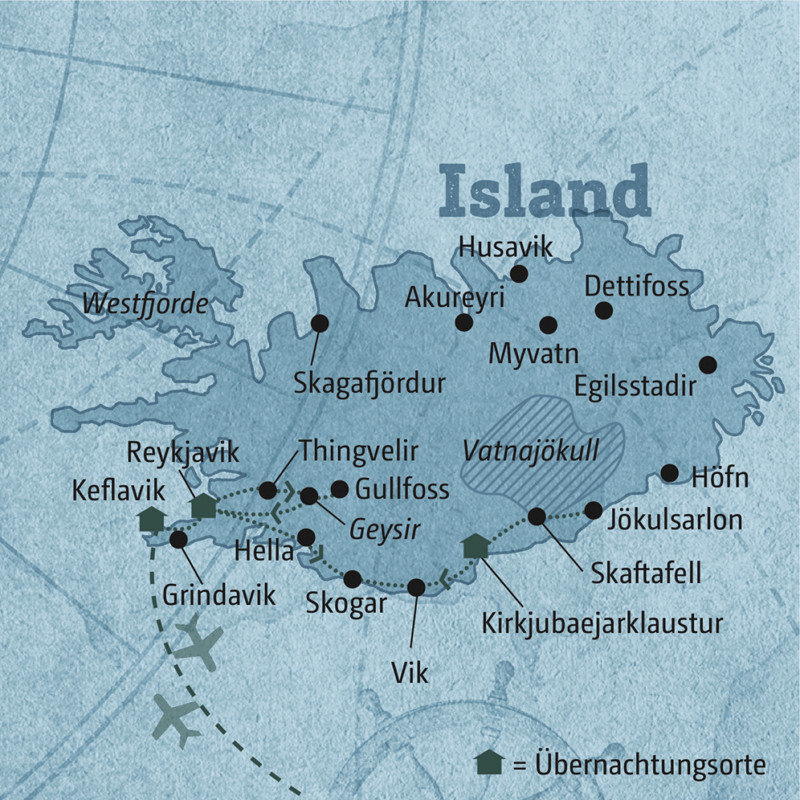 Die Idee dieser ganzjährig attraktiven Reise: Erkunden Sie den naturgewaltigen Süden der Insel mit dem Mietwagen. Der Routenvorschlag unserer Expertin führt Sie vorbei an Geysiren, Fjorden, Vulkanen und Wasserfällen. Ihr Lieblingsort ist der Seljalandsfoss mit einem Weg hinter den tosenden Wassermassen. Laut Statistik gehören die Isländer zu den glücklichsten Menschen der Welt. Ungefähr ein Drittel der 300000 Inseleinwohner treffen Sie in der Hauptstadt REYKJAVIK. Mein Tipp: Schlendern Sie durch den Alten Hafen, machen Sie dabei einen Abstecher zum Wahrzeichen Harpa und buchen Sie eine Bootstour. Die Chance, dass Ihnen Wale und Delfine vor die Kamera springen, ist groß.Auf Ihrer Fahrt durch den Süden Islands dampft und brodelt es – schließlich gehört das Land zu den vulkanisch aktivsten Orten der Welt. Haben Sie den VATNAJÖKULL erreicht, planen Sie unbedingt eine Wanderung auf dem Eis ein. Direkt neben dem größten Gletscher Europas befindet sich die Lagune JÖKULSARLON. Wenn Sie eine der millionenfach auf dem Wasser treibenden Eisschollen herausfischen, halten ein mindestens 3000 Jahre altes Geschenk der Natur in der Hand.