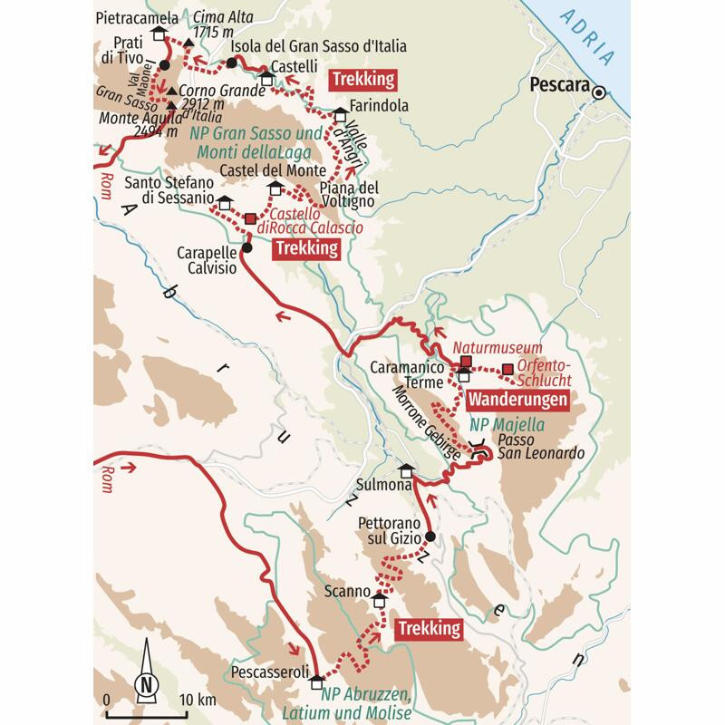 Trekkingreise in Zentral-Italien vom Nationalpark Abruzzen bis zum Nationalpark Gran SassoSteil ragen die imposanten Felswände in der Ferne empor. Im glänzenden See spiegelt sich der strahlend blaue Himmel wider. Über der Schlucht ziehen Mäusebussarde und Steinadler ihre Kreise und das Echo ihrer Schreie erfüllt die Stille um uns. Szenenwechsel: Auf den grünen Wiesen der Hochebene blühen Orchideen. Wildpferde galoppieren vorbei, sie stören sich nicht an den seltenen Besuchern zwischen Appenin und Adria. Der Klang ihrer Hufe verschwindet langsam in der Ferne und lässt uns nachdenklich zurück. Kaum eine halbe Stunde von den Badestränden entfernt schlummert die Bergwelt der Abruzzen in einem gemütlichen Takt. Alles ist langsamer, natürlicher und ursprünglicher – Menschen, Flora und Fauna. Wir durchqueren abseits der ausgetretenen Wanderpfade die gewaltige Naturkulisse Zentralitaliens, passieren schroffe Gipfelketten, wandern durch Täler und Schluchten und machen Halt in traditionellen Dörfern. Mit etwas Glück treffen wir auf unseren Wegen einige Bewohner der Region – Fischotter tummeln sich in den Gebirgsflüssen und Gämsen fühlen sich in der bergigen Landschaft besonders wohl. Beim Genuss des edlen Montepulciano d’Abruzzo kommen wir schnell mit den Einheimischen ins Gespräch, die gerne aus ihrem Leben erzählen – lautstark oder mit den Händen. Und mit den Füßen bewegen wir uns durch die steinige Orfento-Schlucht, wandern am Fuße des mächtigen Gran Sasso und erkunden das imposante Morrone-Gebirge. Die Sonne im Gesicht und schneebedeckte Gipfel vor Augen - Das Herz Italiens schlägt etwas langsamer, aber dafür intensiv.