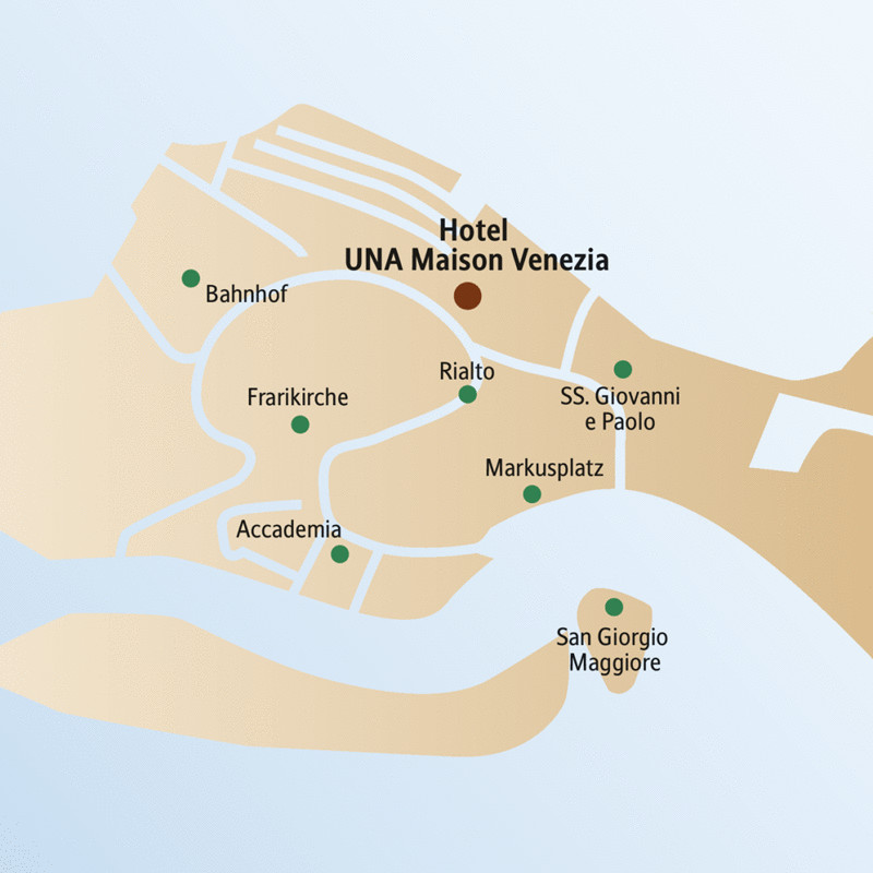 Hotel UNA Maison Venezia****Das elegante Hotel entstand durch den behutsamen Umbau eines stilvollen Privathauses. Es liegt ruhig an einem kleinen Seitenkanal, unweit der Ca' d'Oro und in der Nähe der Rialtobrücke. Morgens erwartet Sie ein reichhaltiges Frühstück, in der gemütlichen Lounge können Sie bei einem Sprizz entspannen. Die 37 im venezianischen Stil eingerichteten Zimmer im Haupthaus sowie im Nebengebäude verfügen über Klimaanlage, Sat.-TV, WLAN (kostenfrei), Minibar, Safe und Föhn. Die Einzelzimmer sind kleiner als die Doppelzimmer und verfügen über nur ein Bett. Ein sehr gutes Hotel in ruhiger Lage.